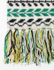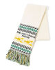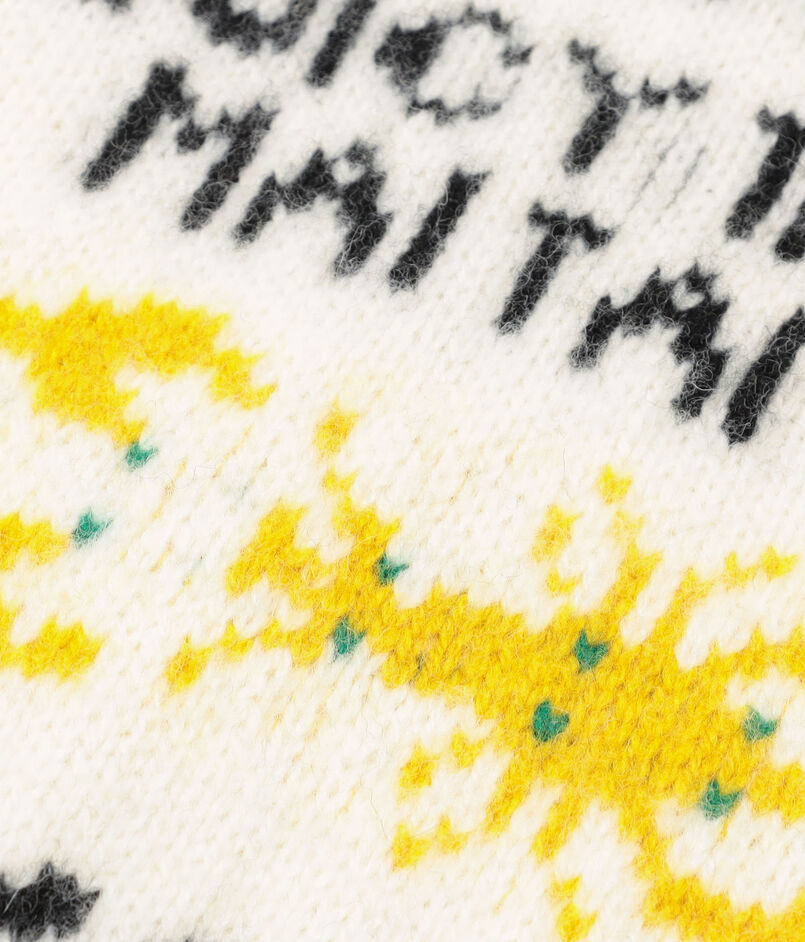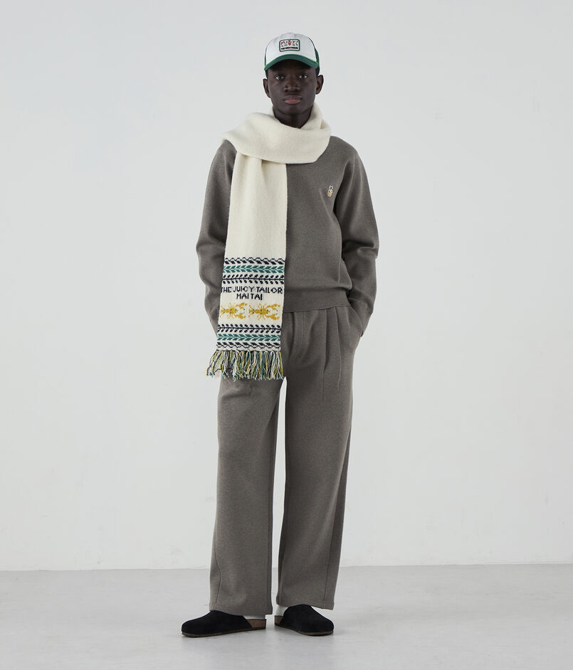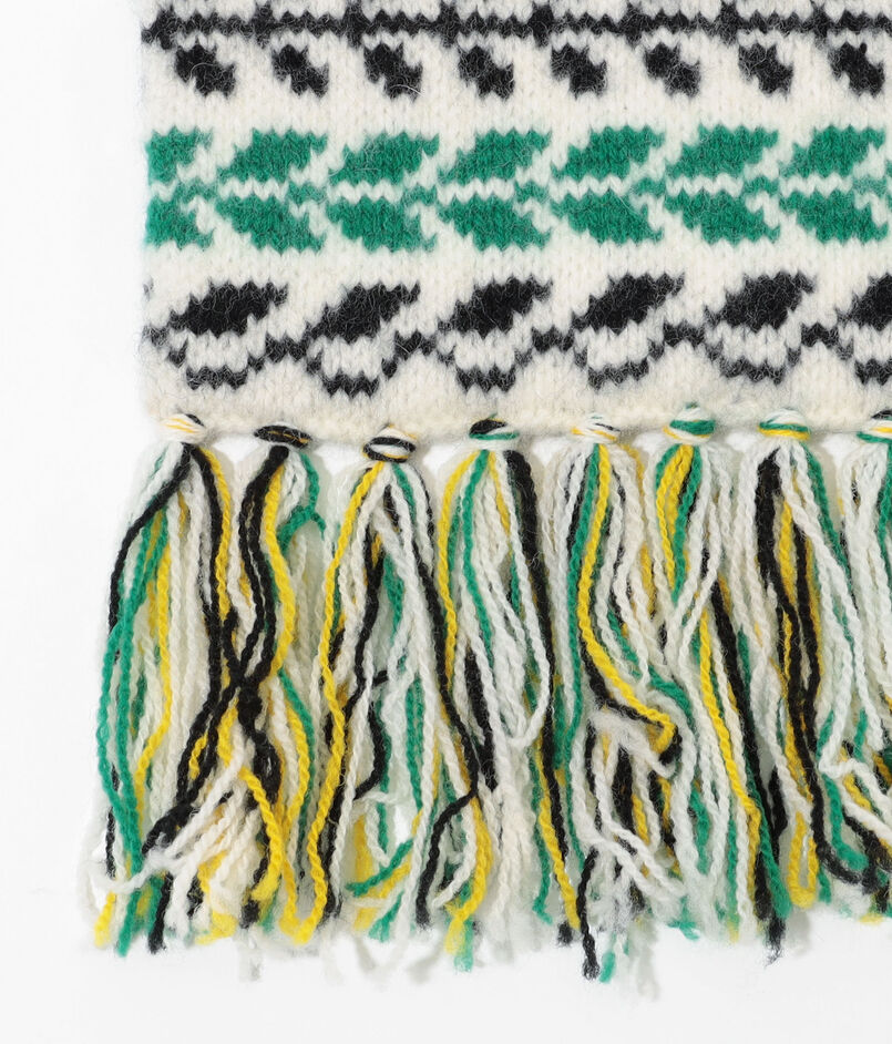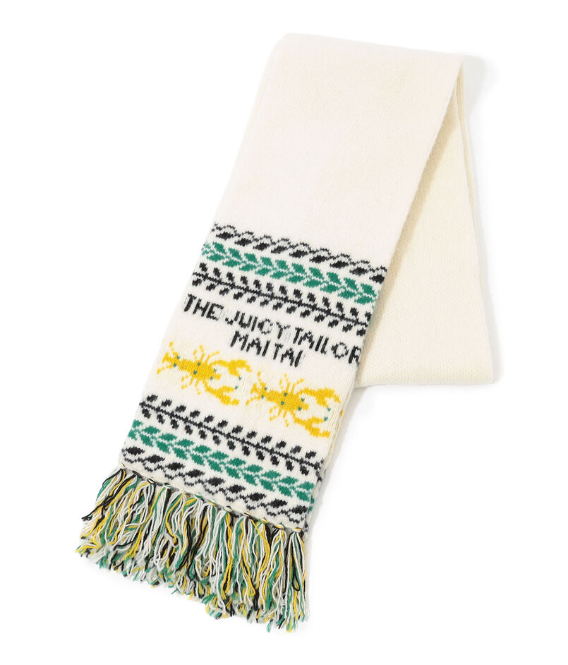 パイン(パイナップル)とロブスターの2種の柄をダブルジャカード編みで表現し、ほど良いボリューム感と温かみのある風合いに仕上げました。杢糸(もくいと)使いのフリンジがボリュームとテクスチャーのアクセントになっています。