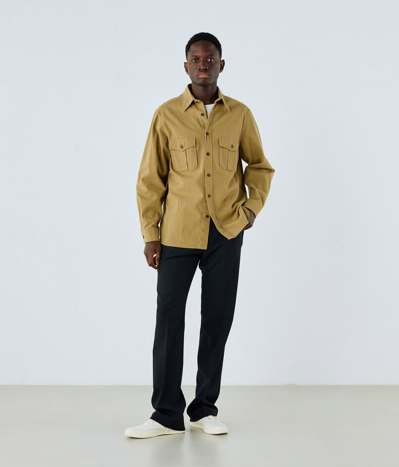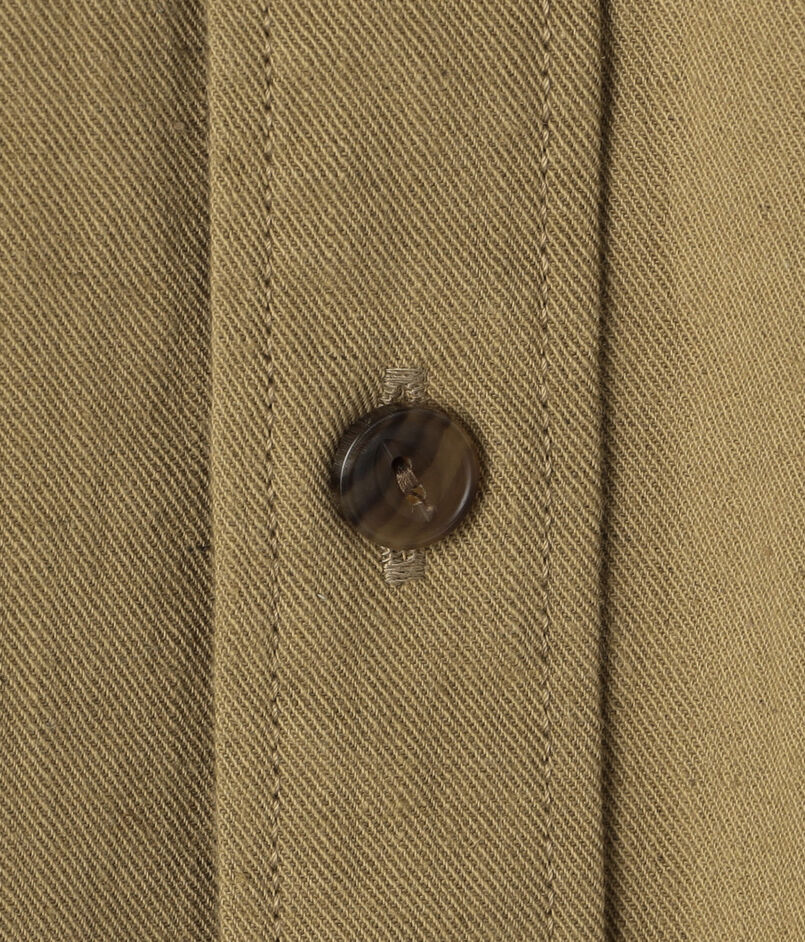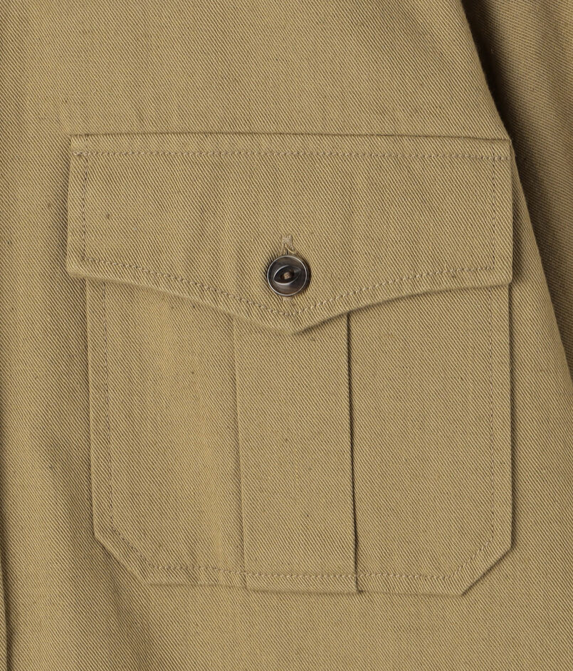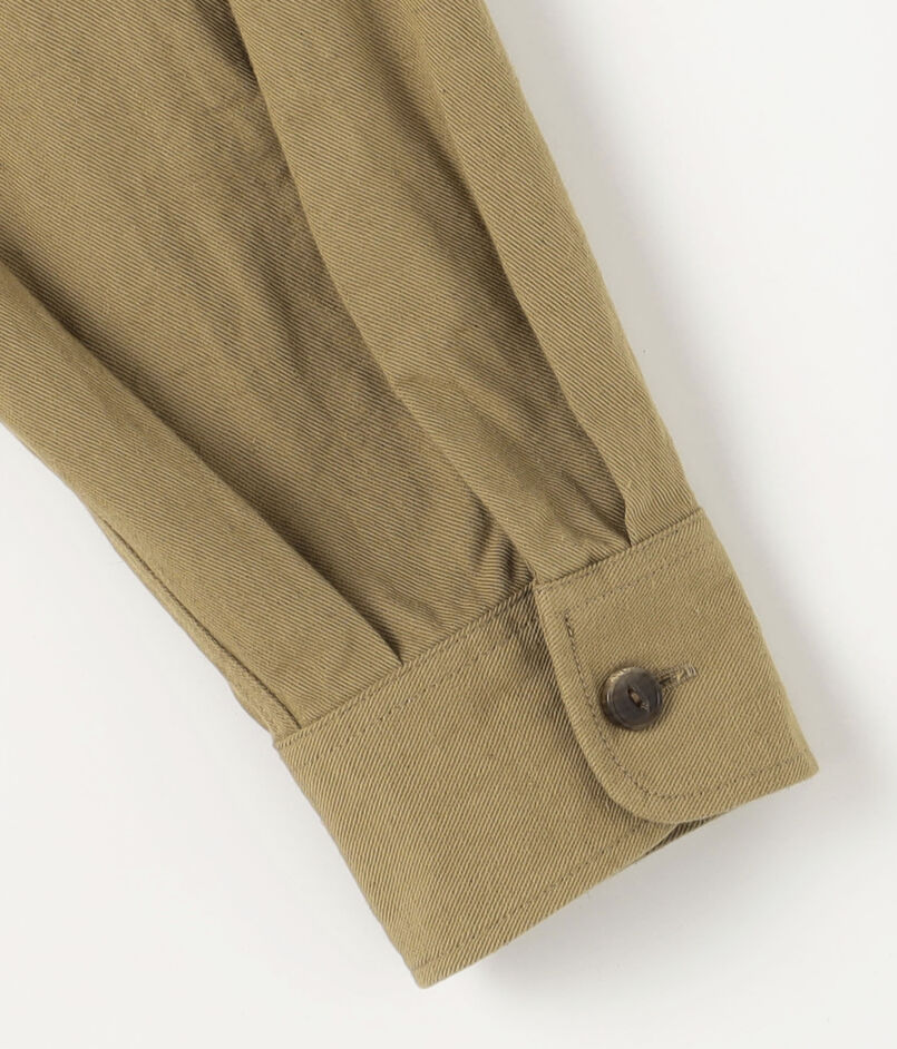デザインは、オーセンティックなサファリシャツ。ほど良くボリュームのあるシルエットにし、シャツブルゾンとしても活躍するアイテムです。釦はミリタリーホーン釦を使用して上質な仕上がりとなっています。