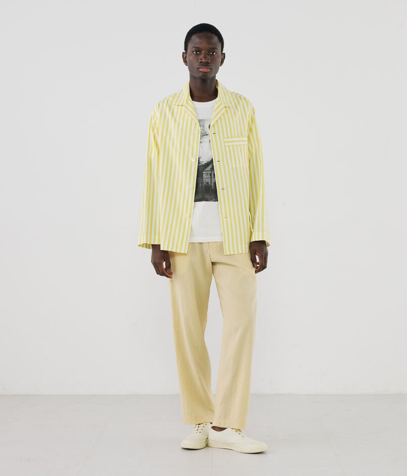 驚くほど軽く、滑らかな質感の生地をベースに、鮮やかなカラーパレットで表現したストライプのライトウェイトポプリンのパジャマシャツ。