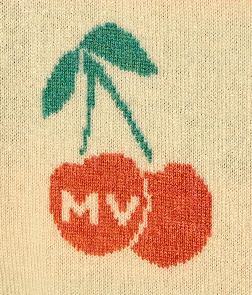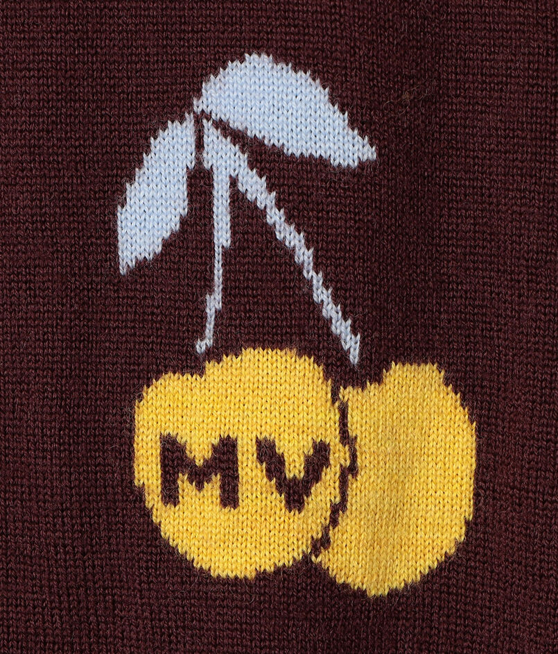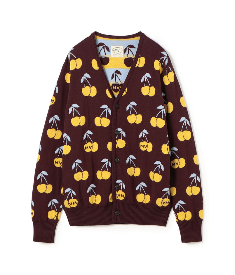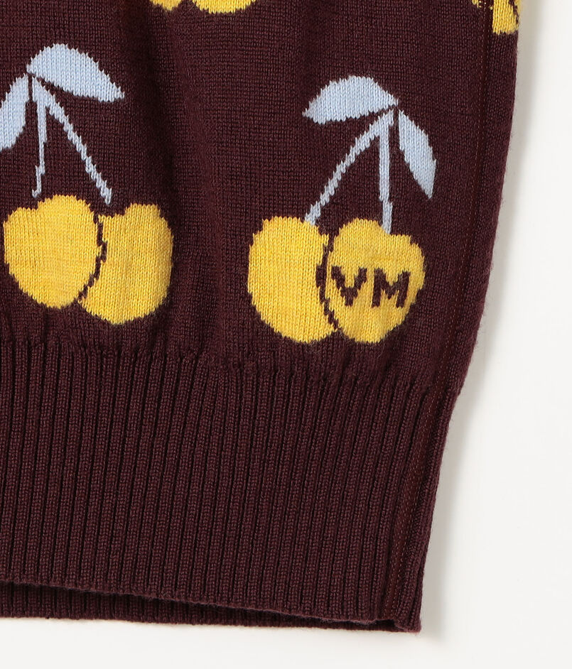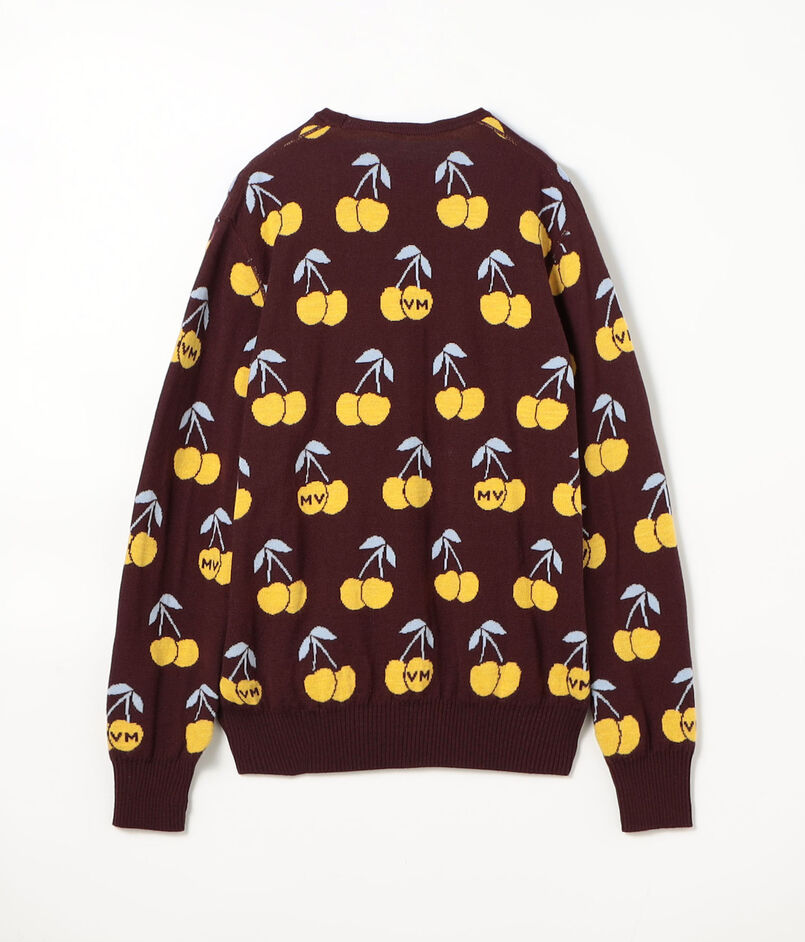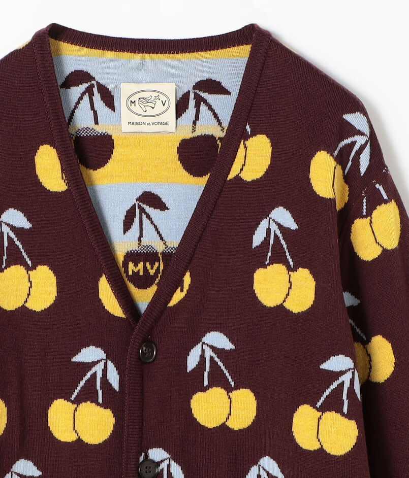 〈MAISON et VOYAGE〉のオリジナルであるチェリー柄が目を引く、遊び心のあるデザイン。リバーシブル仕様で、表と裏で異なる配色を楽しめます。どちらの面で着ても「MV」のロゴが見えるよう、緻密に計算された配置。脇線などはフラットシーマ縫製で仕上げ、袋ジャカードならではの柄の反転を存分に楽しめる一着です。