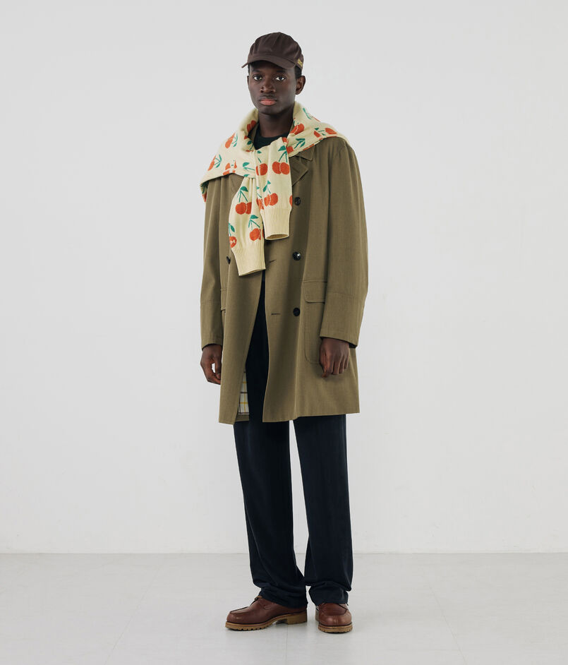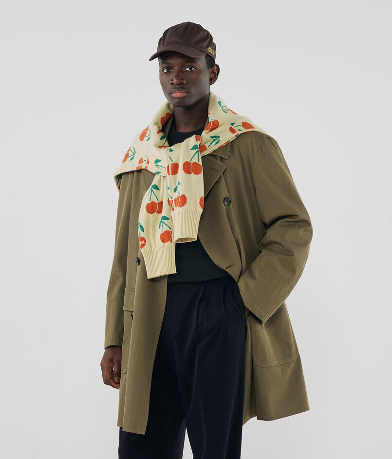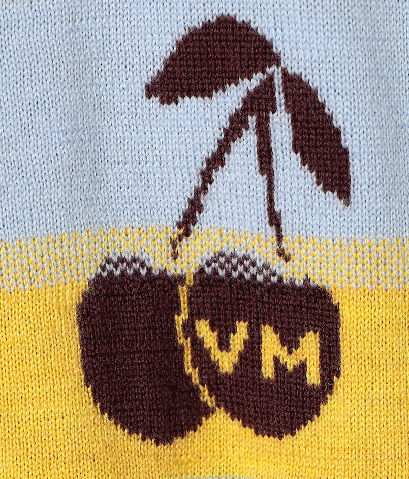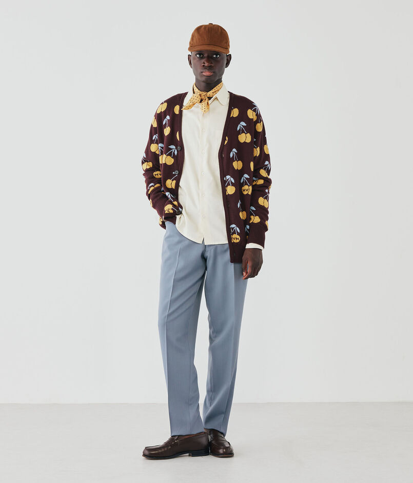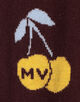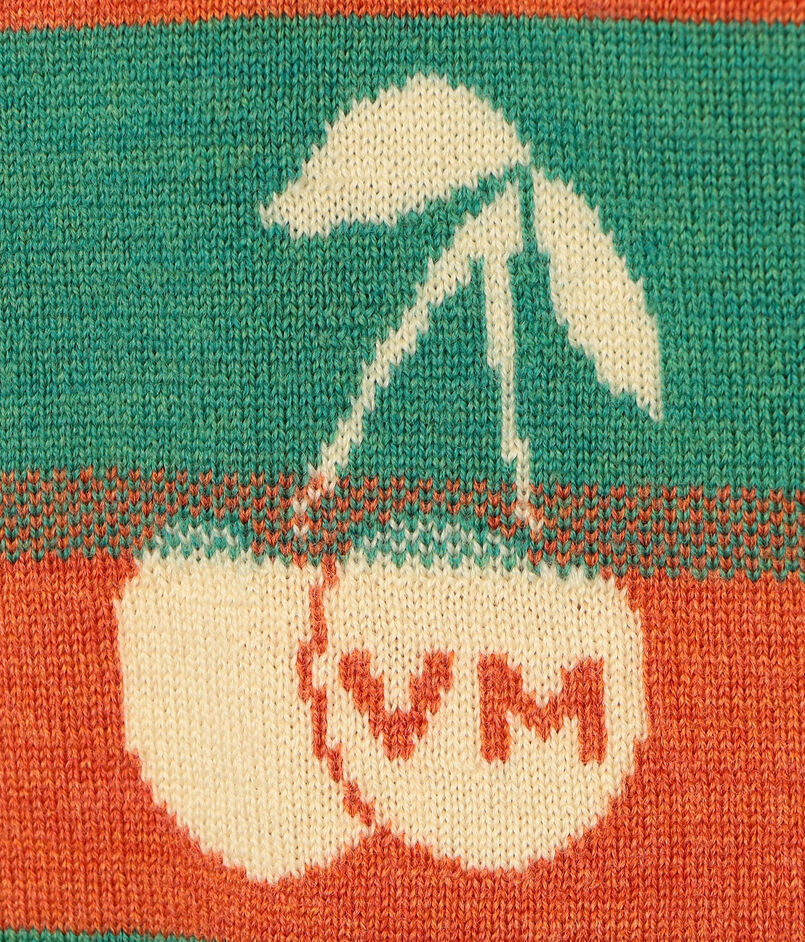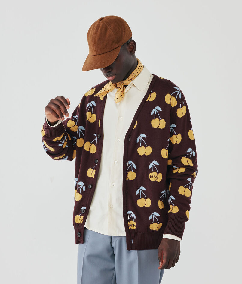 〈MAISON et VOYAGE〉のオリジナルであるチェリー柄が目を引く、遊び心のあるデザイン。リバーシブル仕様で、表と裏で異なる配色を楽しめます。どちらの面で着ても「MV」のロゴが見えるよう、緻密に計算された配置。脇線などはフラットシーマ縫製で仕上げ、袋ジャカードならではの柄の反転を存分に楽しめる一着です。