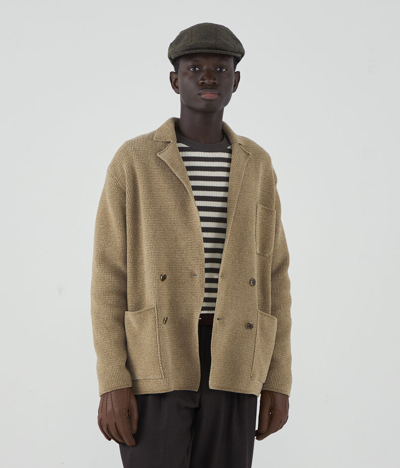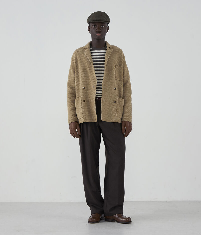 フロントはダブルブレスト仕様に、〈MAISON et VOYAGE〉オリジナルのロゴ入り七宝ボタンを贅沢に使用。着丈は標準からやや長めに設定されており、きれいめカジュアルなスタイリングを洗練させる一着。