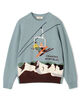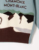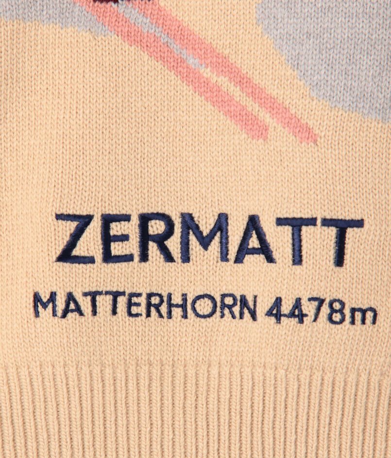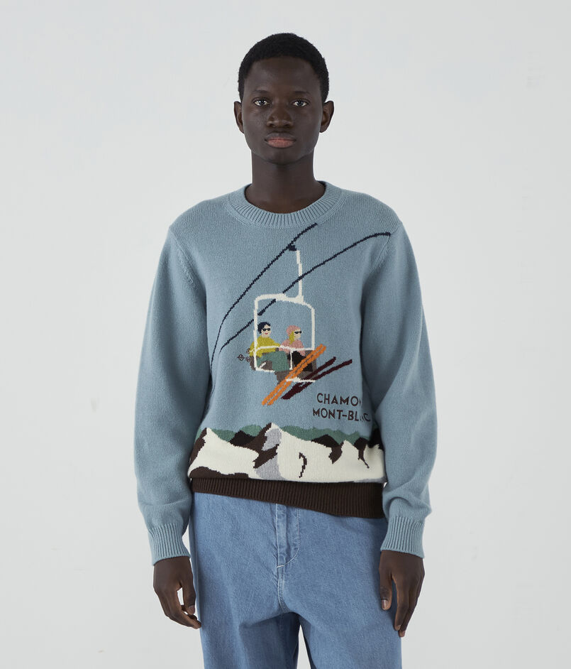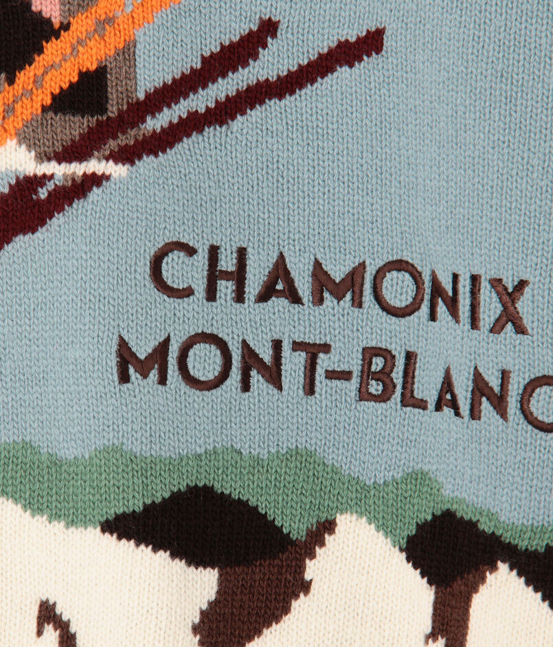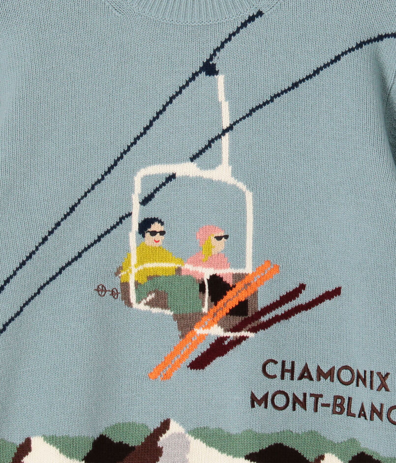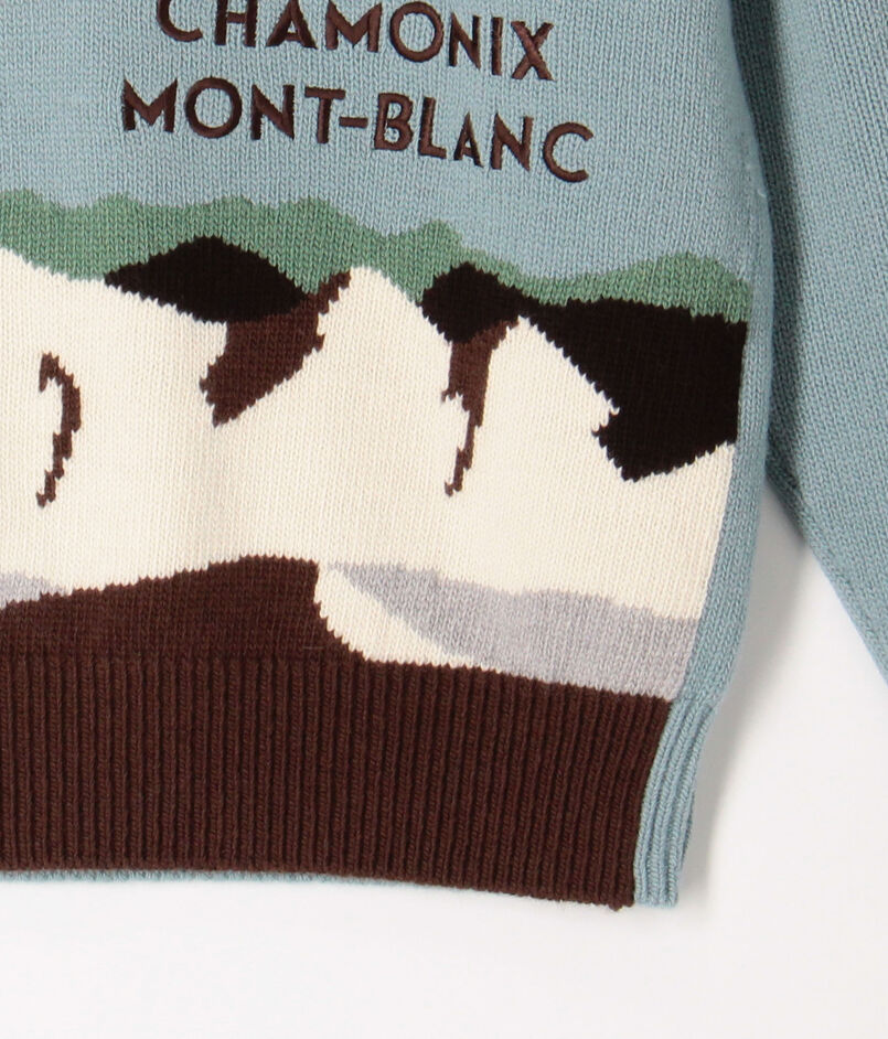 「雪山の旅」をテーマに、楽しい風景をインターシャ柄で表現しました。発色の良い鮮やかな配色はもちろん、部分的に取り入れられた刺繍テクニックが、立体感と遊び心を加えています。手元に置いて、その細かなこだわりを楽しみたくなる特別な一着です。