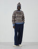伝統的な雪柄の中に「MV(MAISON et VOYAGE)」ロゴがさりげなく配置され、遊び心あるデザインポイントになっています。サイジングは、シーズントレンドである深めのタックパンツなどとバランス良く決まります。色目が暗くなりがちな冬の差しアイテムとしても最適です。