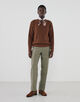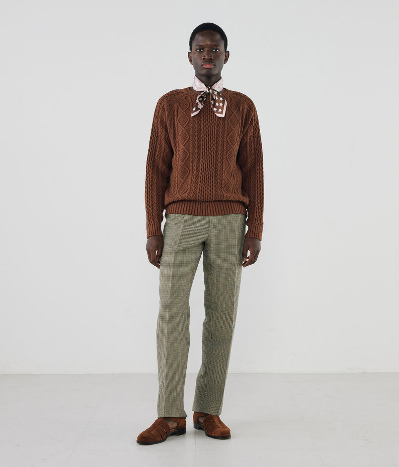 本来は無骨な印象の強いケーブル編みですが、空気をたっぷりと含んだかさ高なシルク糸を用いることで、ツイーディな表情はそのままに、軽やかで柔らかな肌当たりを実現しました。仕上げの洗い加工によって表面に絶妙なフェード感を出し、ヴィンテージのようなこなれた風合いを表現しています。シルク特有の優れた保温性と吸湿性を備えているため、春先の肌寒い時期から、夏の冷房対策、そして秋口まで、季節を問わず年間を通して快適に着用可能です。