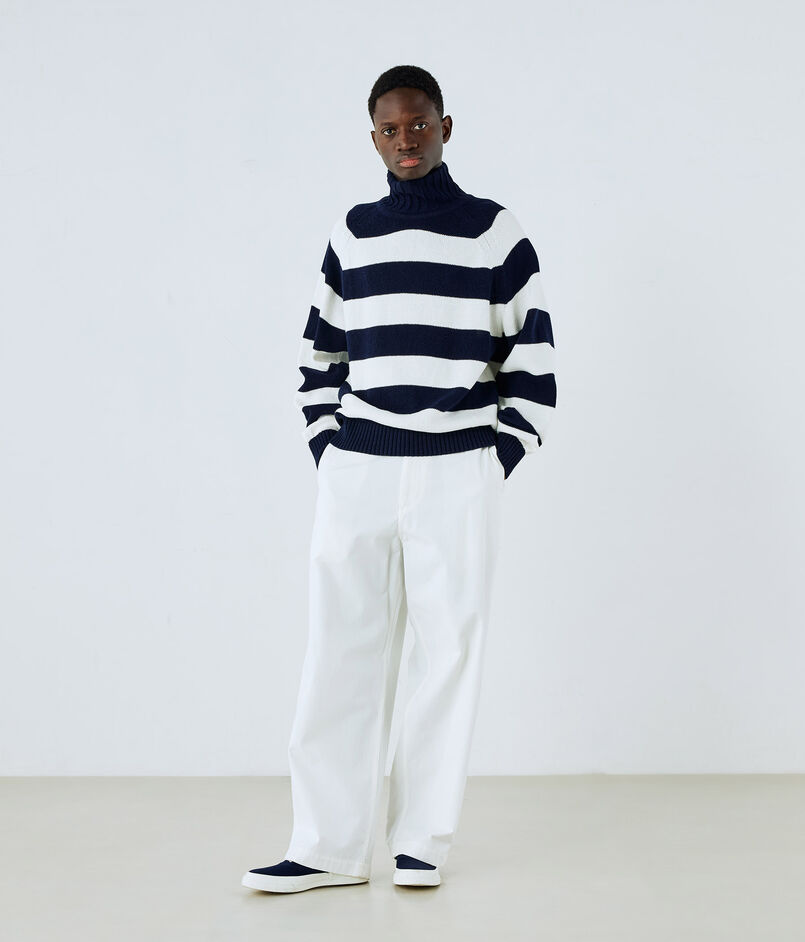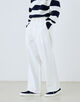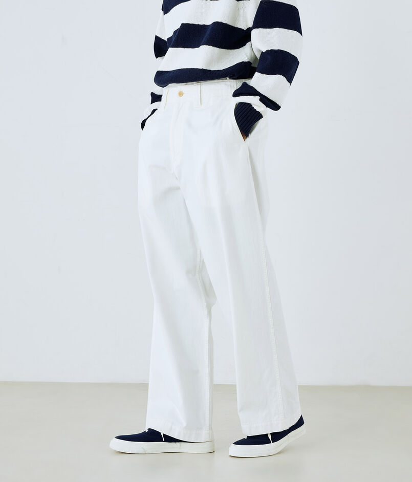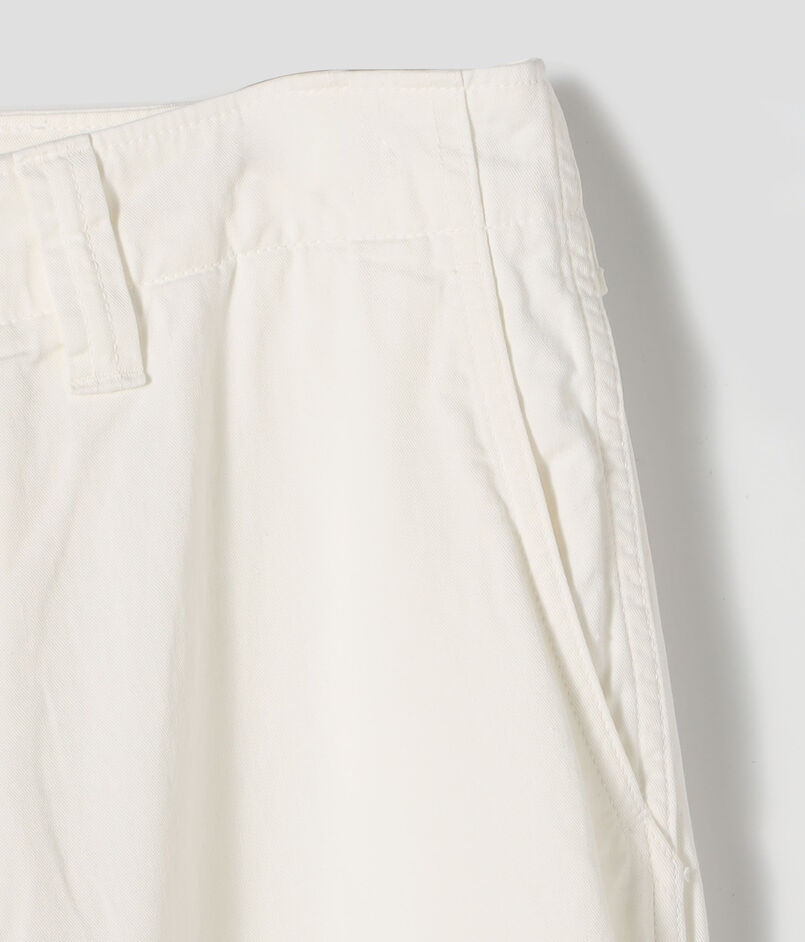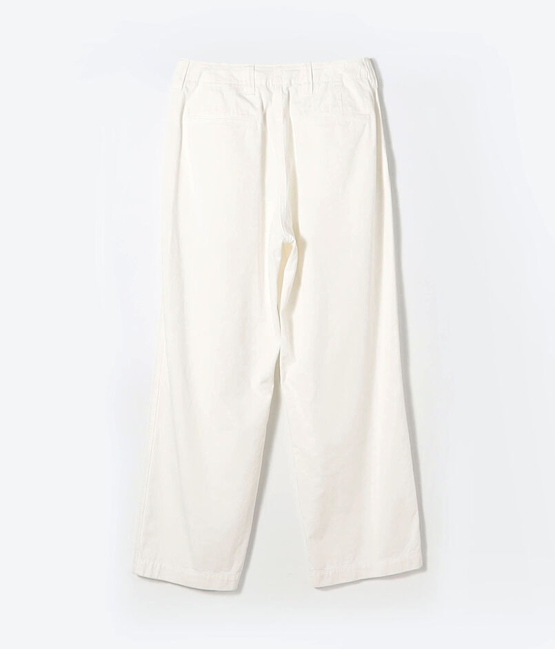高密度に織り上げたツイルを使用したワイドシルエットチノ。シャットル織機で織あげることで、ハリ感やコシはありながらも、膨らみがある風合いに仕上がります。