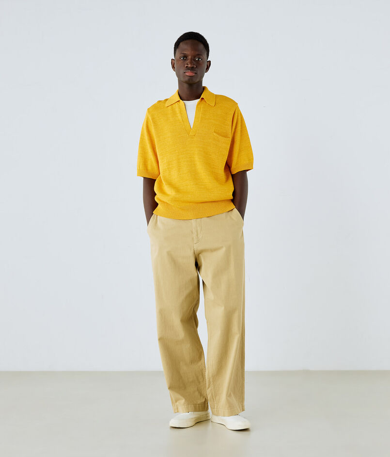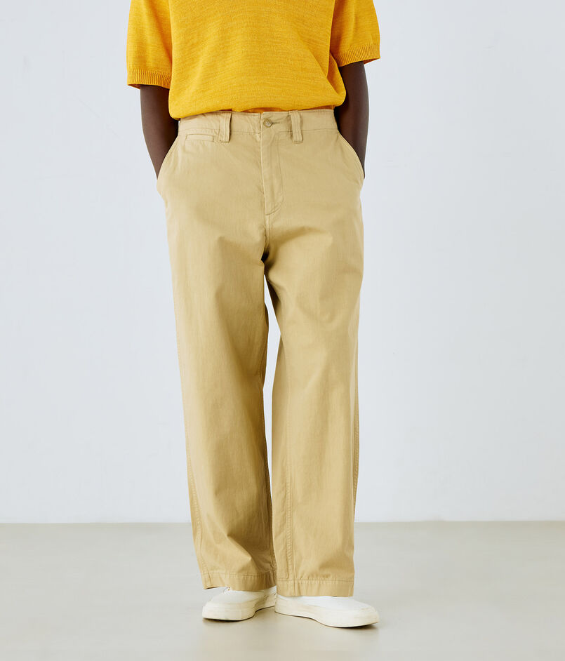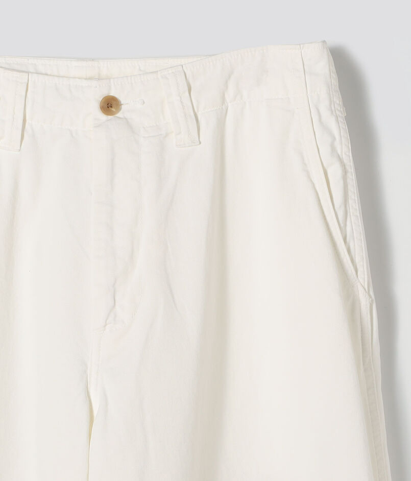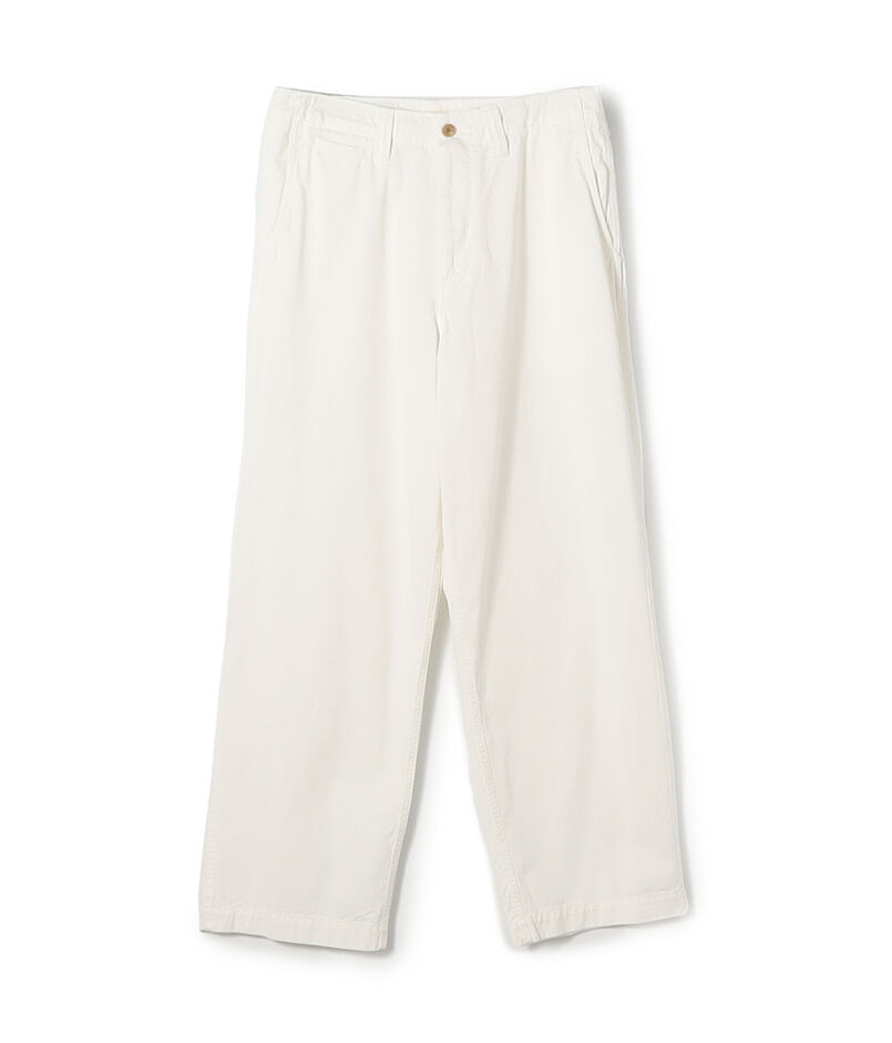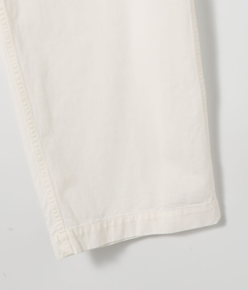 デザインはワイドストレートシルエットのチノパンツ。製品染めをすることでより柔らかな履き心地を実現し、バイオ加工をいれることでやや褪せた色合いに仕上げています。