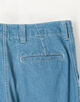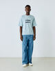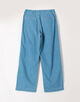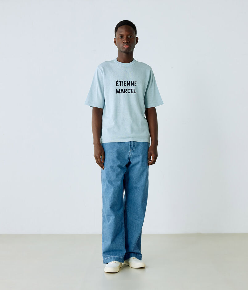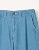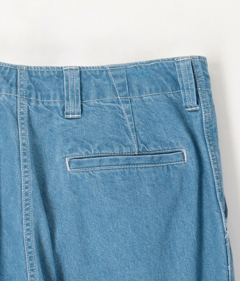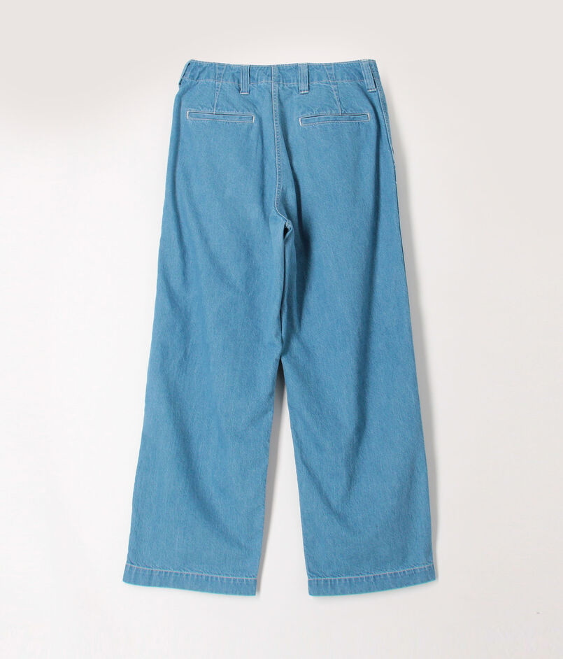 10オンスのムラ糸デニムを使用した、豊かな表情が魅力のワイドストレートパンツ。ワンウォッシュの濃色インディゴには金茶のステッチを、バイオブリーチ加工を施した淡色インディゴにはオフホワイトのステッチを配し、それぞれの色合いを際立たせました。