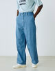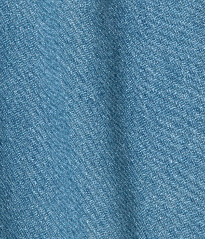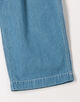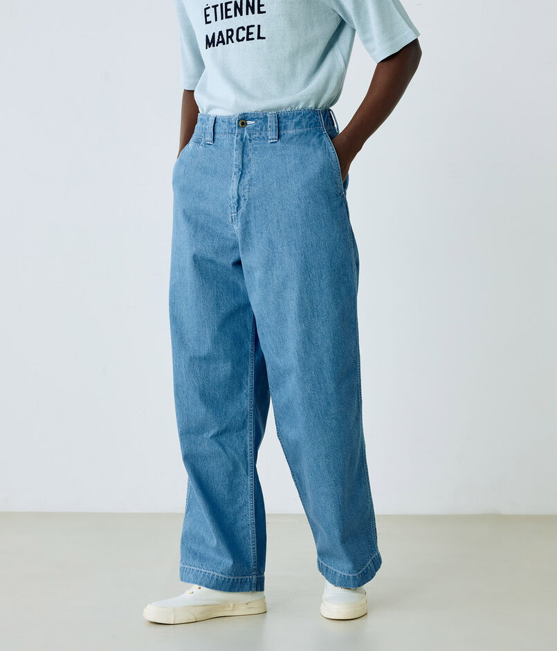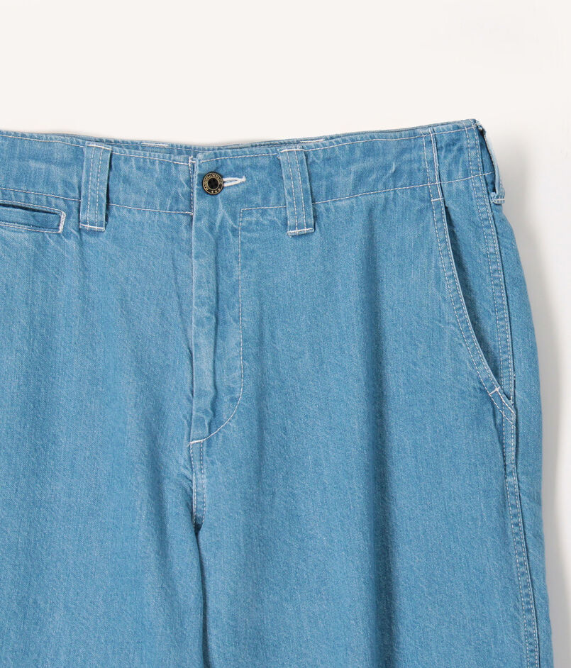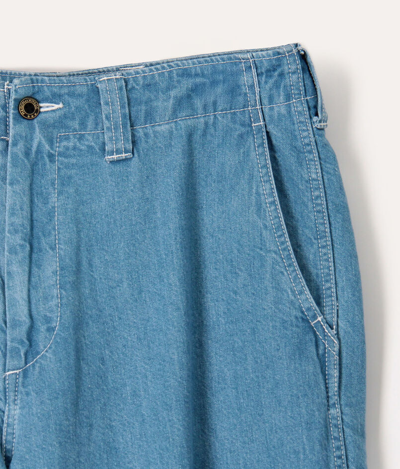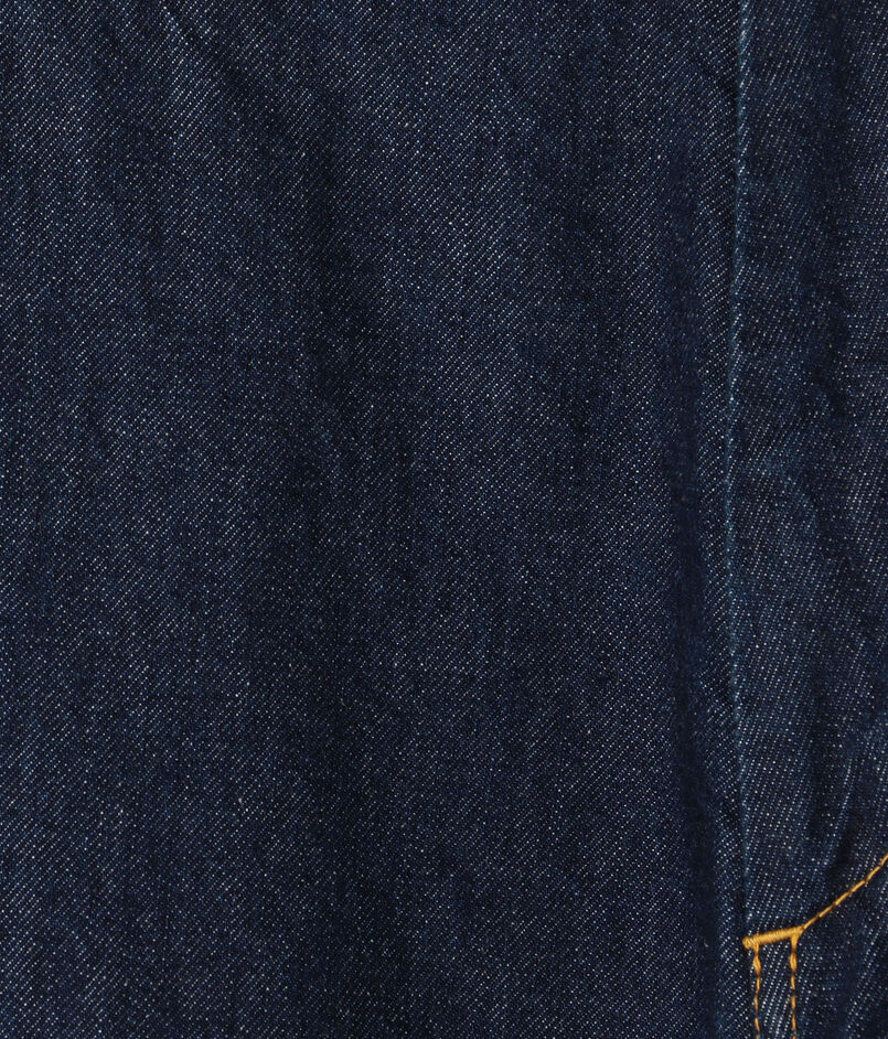 10オンスのムラ糸デニムを使用した、豊かな表情が魅力のワイドストレートパンツ。ワンウォッシュの濃色インディゴには金茶のステッチを、バイオブリーチ加工を施した淡色インディゴにはオフホワイトのステッチを配し、それぞれの色合いを際立たせました。