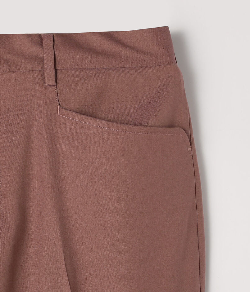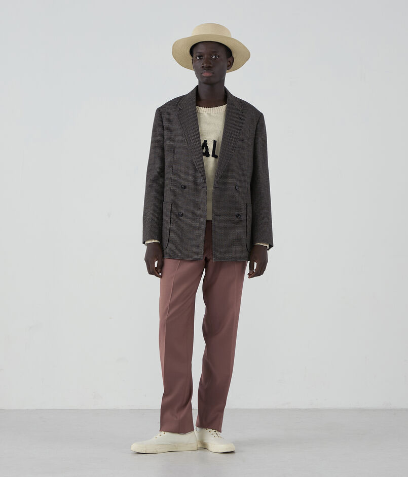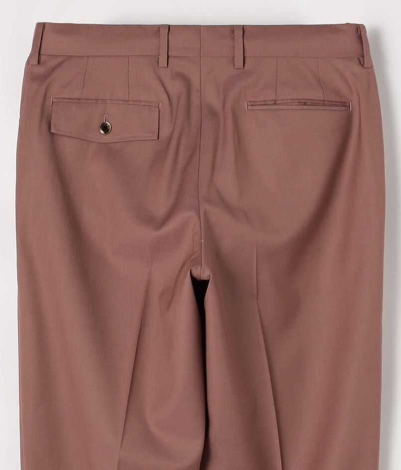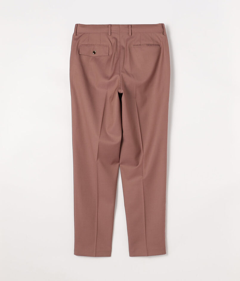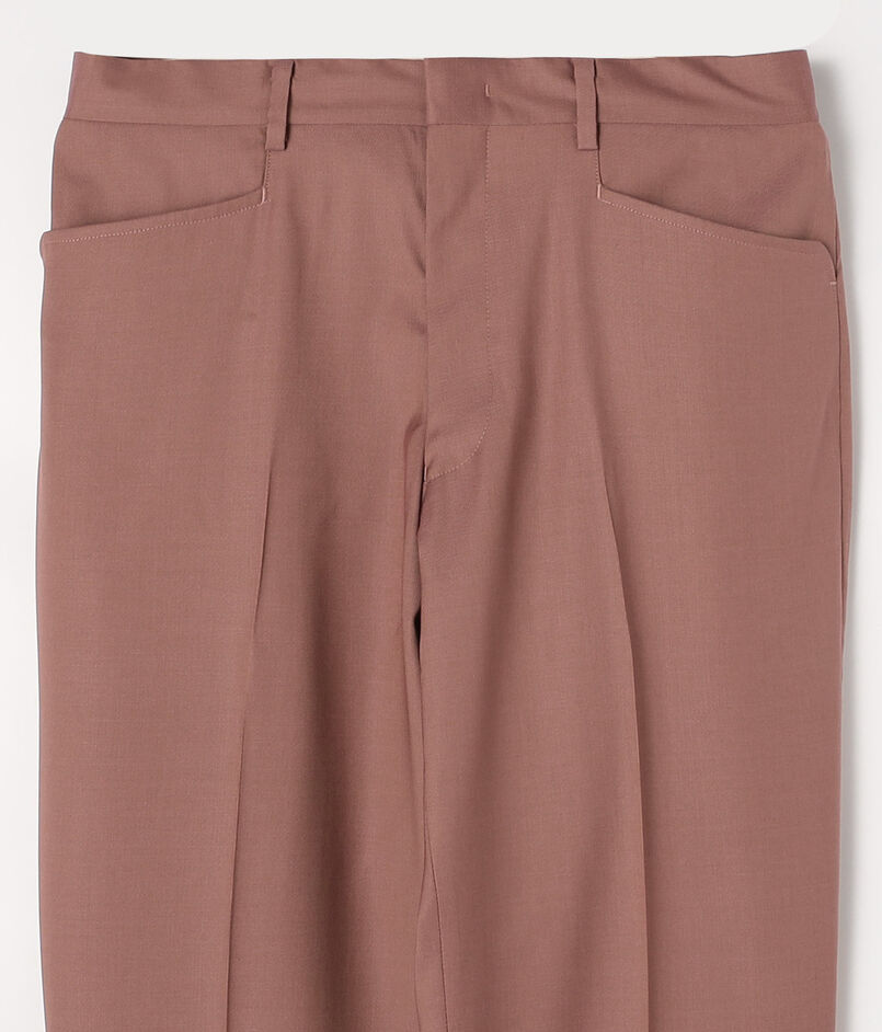 モデルはフレンチクラシックのノープリーツ+L型ポケット(L-PK)仕様。ヒップからワタリにかけて程よいボリュームを持たせ、裾に向かって緩やかに絞ったテーパードシルエット。