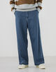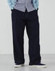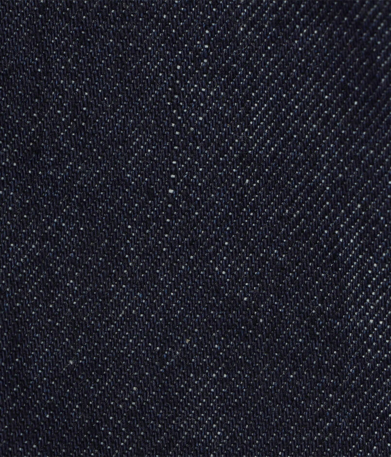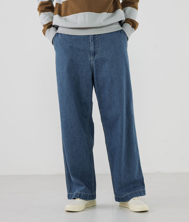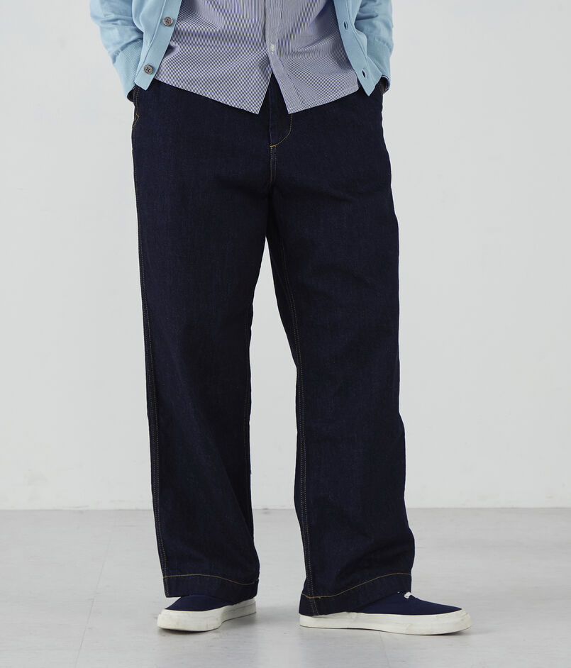 10オンスのムラ糸デニムを使用した、豊かな表情が魅力のワイドストレートパンツ。ワンウォッシュの濃色インディゴには金茶のステッチを、ボールバイオ加工を施した淡色にはオフホワイトのステッチを配し、それぞれの色合いを際立たせました。