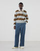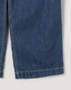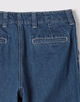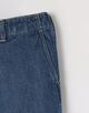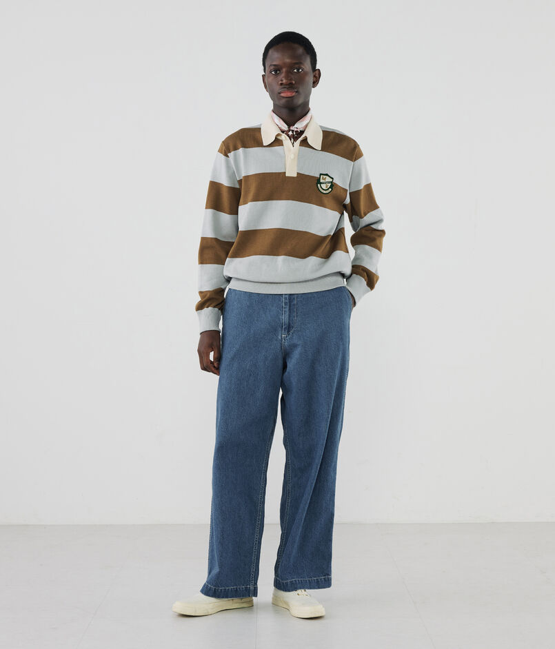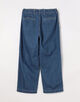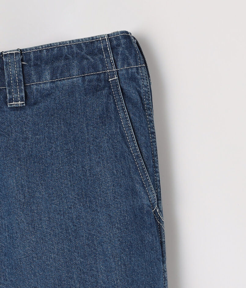 10オンスのムラ糸デニムを使用した、豊かな表情が魅力のワイドストレートパンツ。ワンウォッシュの濃色インディゴには金茶のステッチを、ボールバイオ加工を施した淡色にはオフホワイトのステッチを配し、それぞれの色合いを際立たせました。