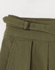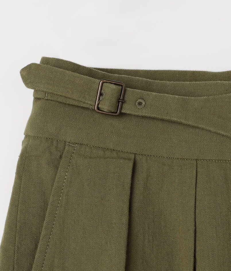 デザインの核となるのは、グルカショーツのアイデンティティを継承したベルテッド仕様。アンティークゴールドのパーツが、旧式紡績ならではの深い風合いをさらに引き立てます。