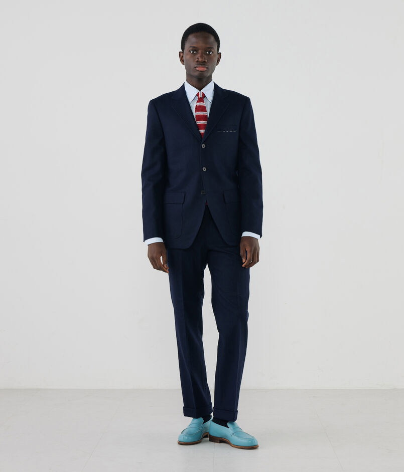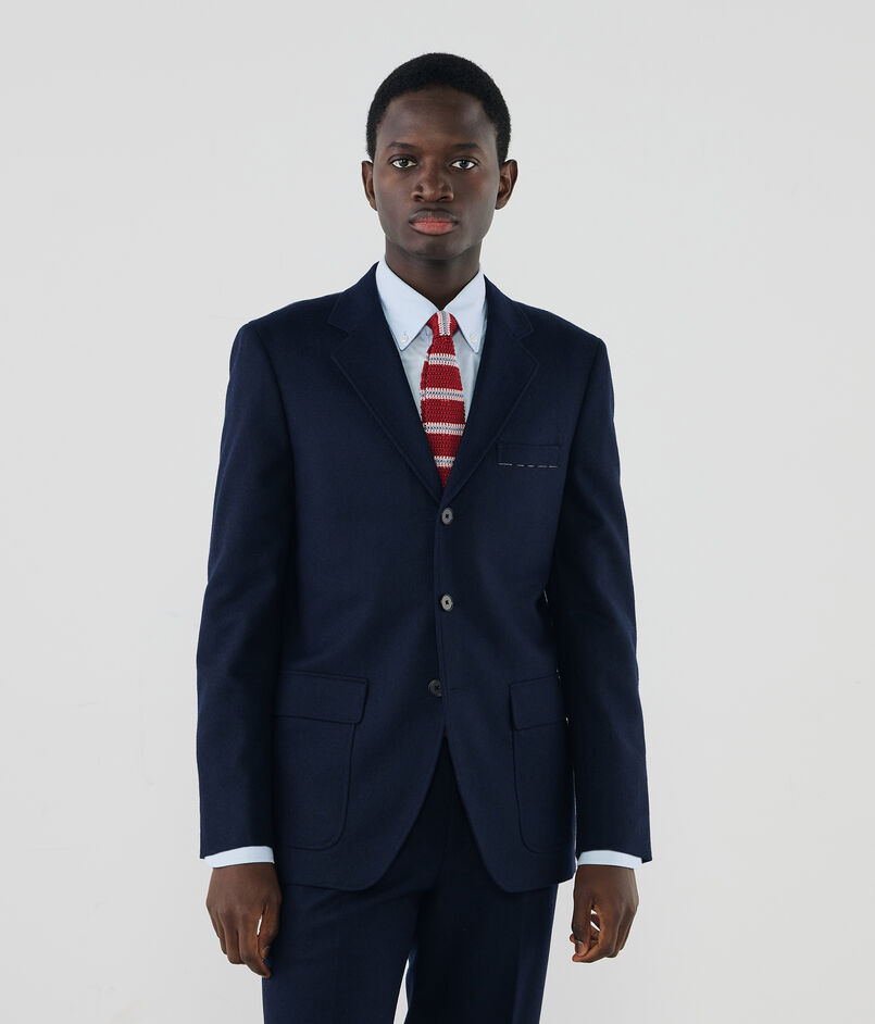 ナチュラルショルダー、センターフックベントといったディテールに、素材の特性に合わたハーフキャンバス仕立てが特徴のジャケット。