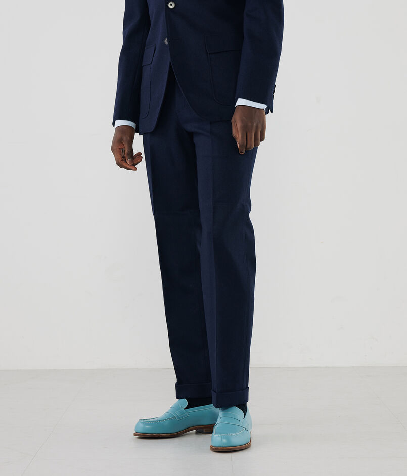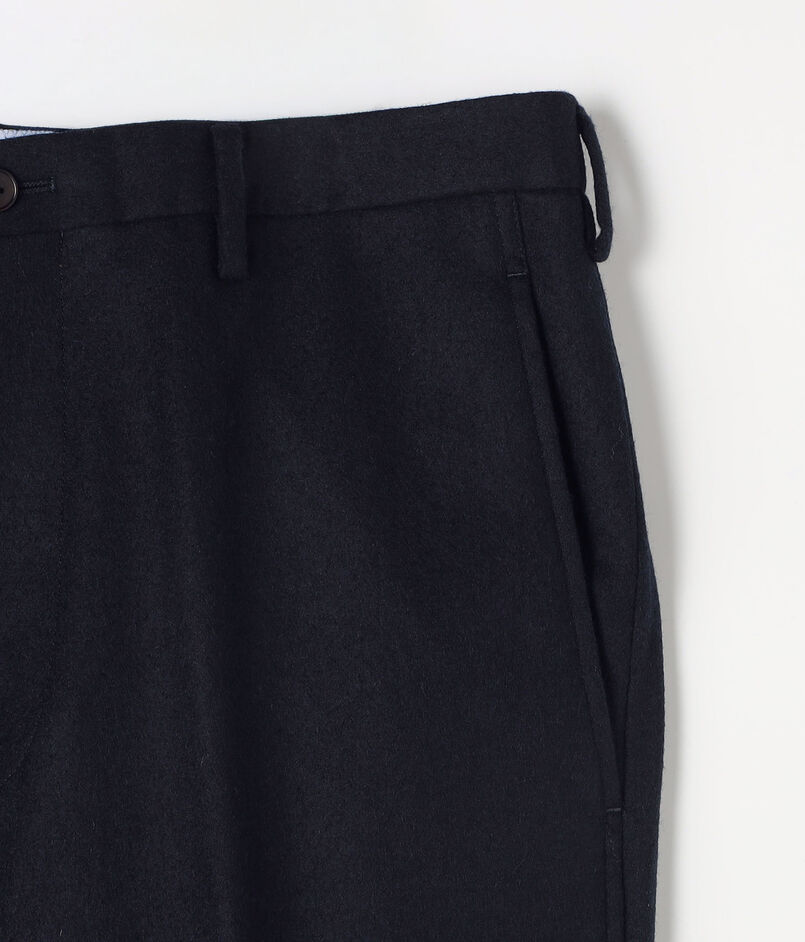 パンツはほどよいテーパードシルエットながら、ワタリ巾から裾巾の差寸が少ないパイプドステムというお決まりのシルエットを踏襲した、ノープリーツモデル。