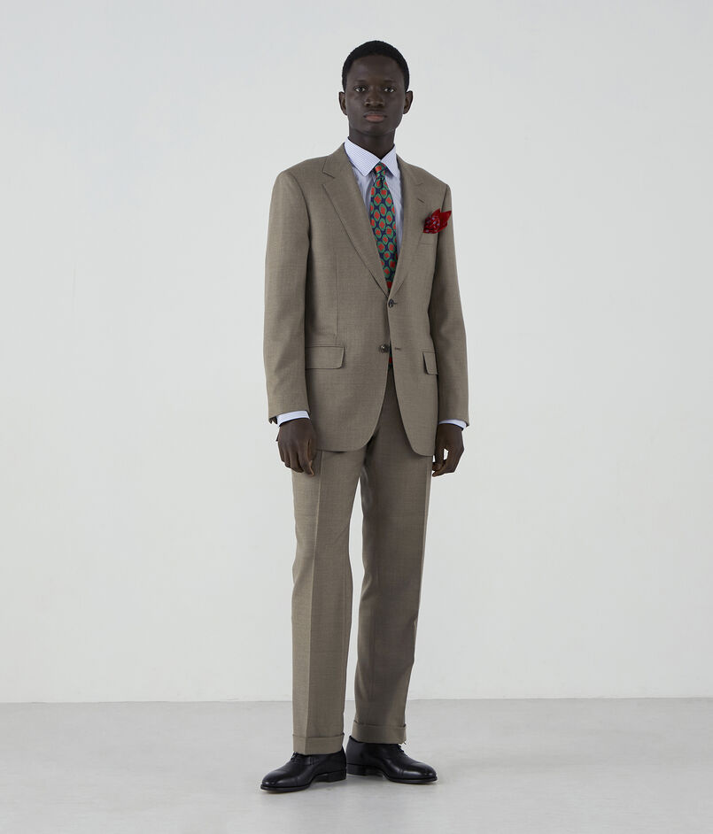 セミノッチラペルが特徴的なシングルブレステッド2ピーススーツ。