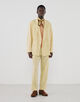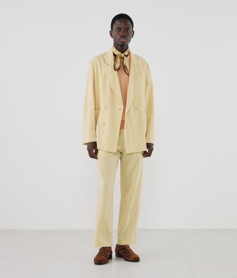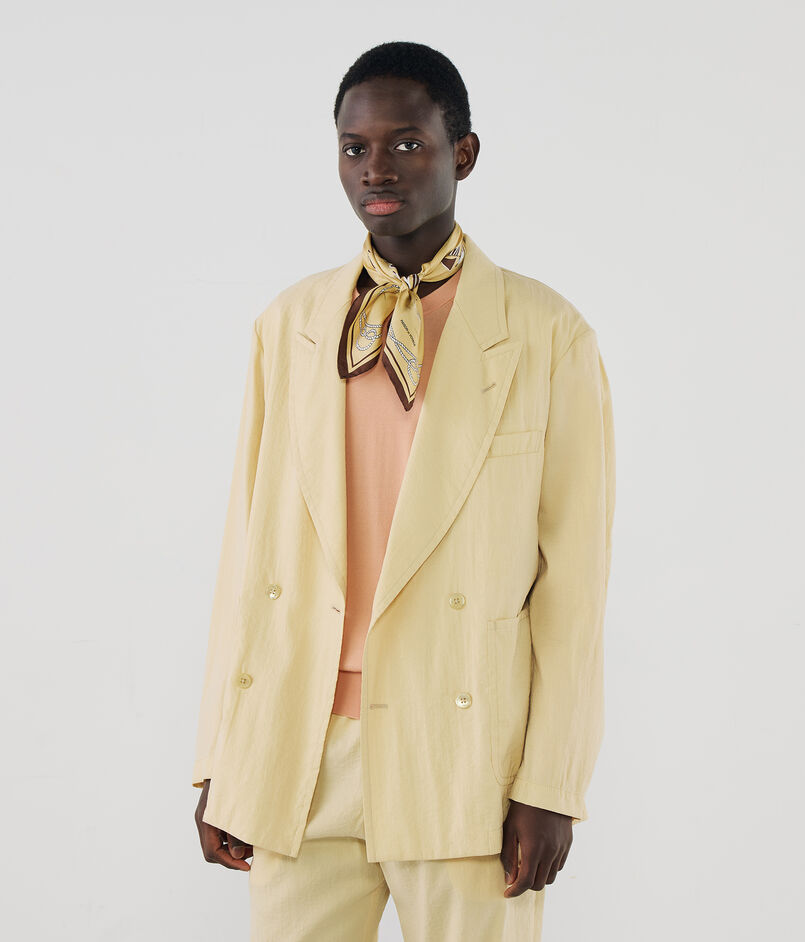 デザインは、あえてフロントのダーツを省いたリラクシーなボックスシルエット。ダブル4ボタンのピークドラペルは、ゴージ位置を低めに設定することで90年代のムードを色濃く反映しました。計算されたパターンにより、ほど良いボリューム感と丸みを帯びた立体的なフォルムが生まれます。