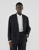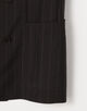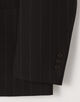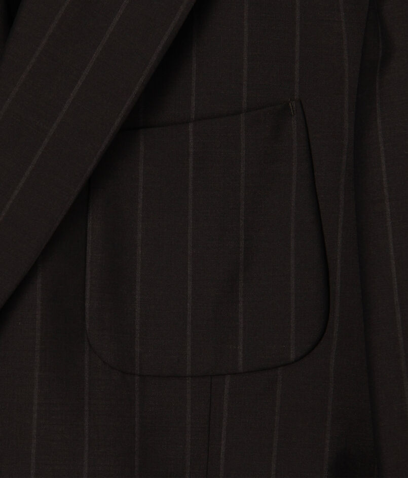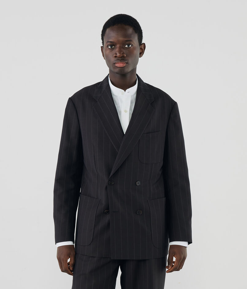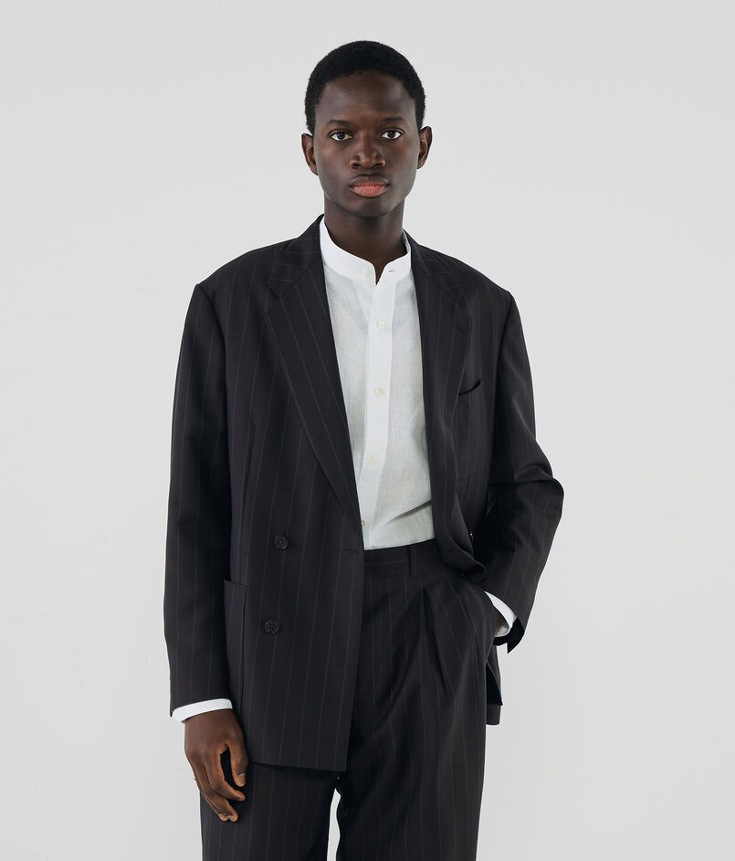 ジャケットは、ゆったりとした肩まわりからウエストにかけて緩やかにシェイプさせた、モダンな「Y字シルエット」のダブルブレスト。そこに、インバーテッドプリーツが目を引く「バレルシルエット(樽型)」のパンツを合わせることで、80年代のアーカイブを彷彿とさせるクラシックさと、現代的な新鮮さが共存する絶妙なバランスを表現しています。素材のクオリティに裏打ちされた、洗練された大人のための贅沢な一着です。