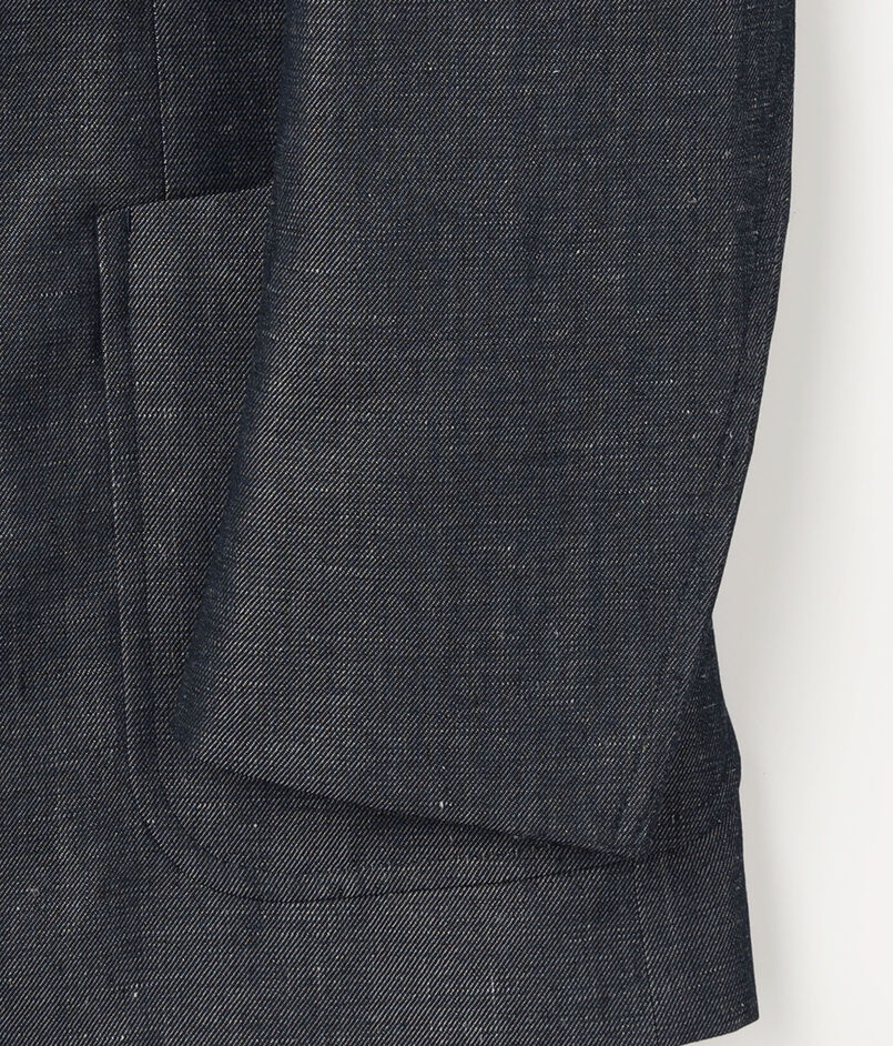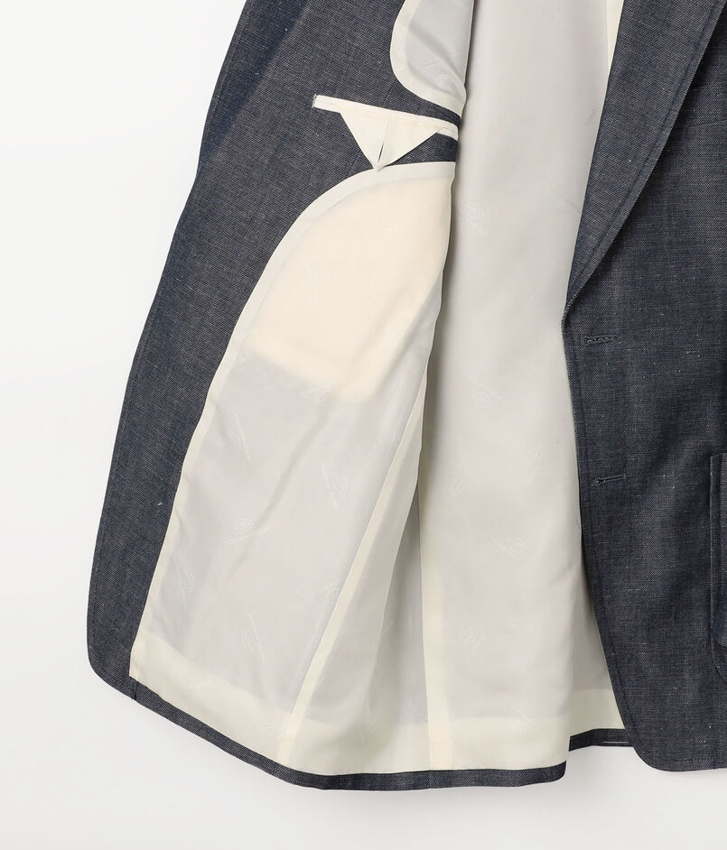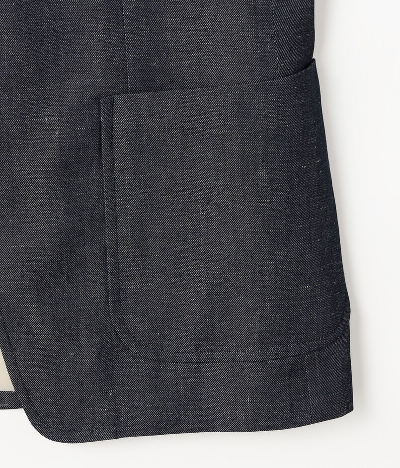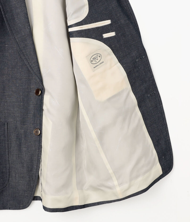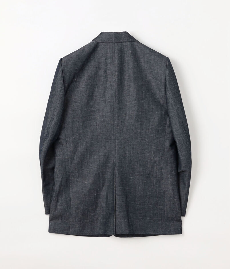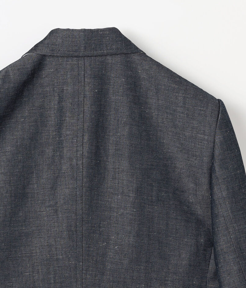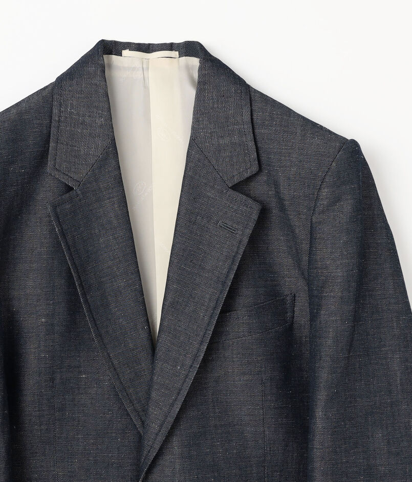 フランスの名門〈DORMEUIL(ドーメル)〉社へのスペシャルオーダーをしたファブリックを使用したジャケット。名作『TONIK(トニック)』にも使われるパタゴニアウールを経糸に、緯糸にはリネンを配した3/1ツイルのデニムルック・ファブリックです。ウールの弾力とリネンの清涼感が共存するこの素材。