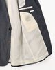 デザインは、70年代のフレンチスタイルを彷彿とさせる、ノッチドラペルの2ボタンブレザー。 最大の特徴は、肩先を鋭く立ち上げたコンケーブドショルダー。あえて低めに設定されたゴージラインと、高めの位置でシェイプされたウエストラインが、現代にはないグラマラスで色気のあるシルエットを描き出します。クラシックな装いはもちろん、モードな着こなしにも呼応する多面的な一着です。