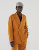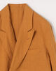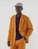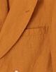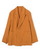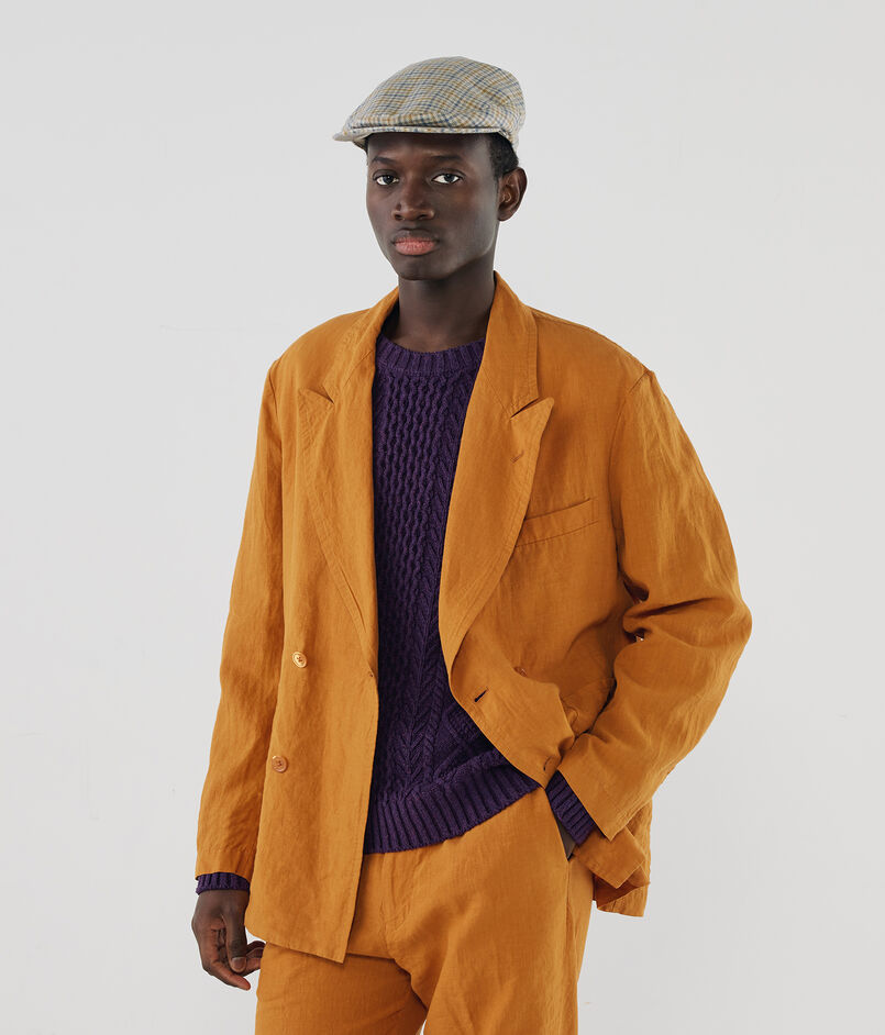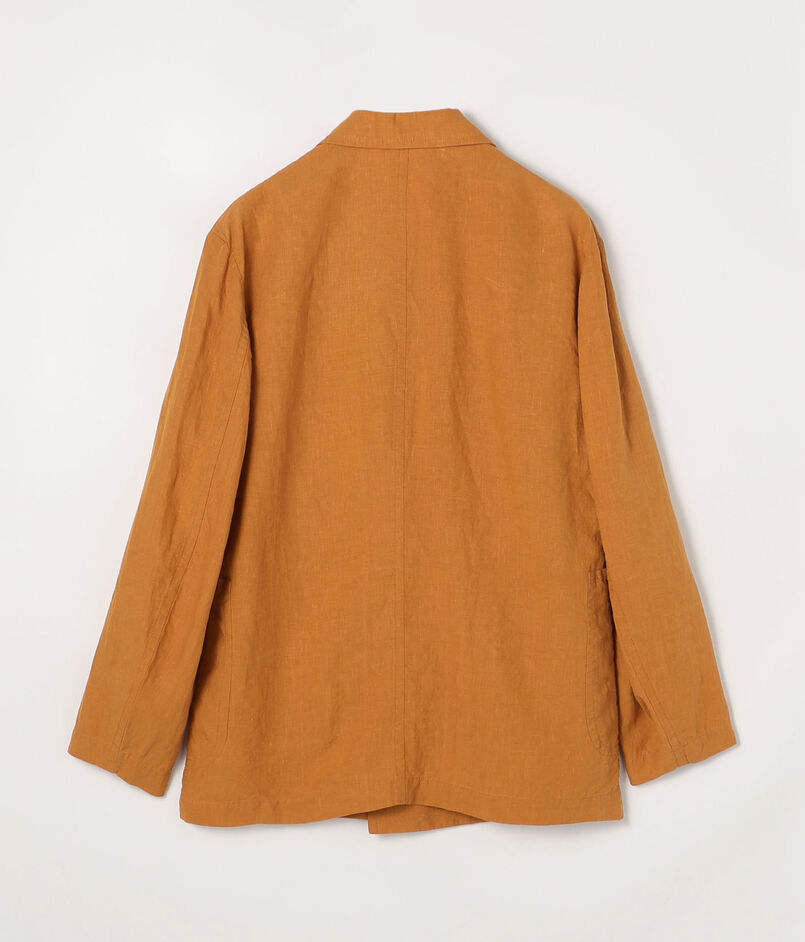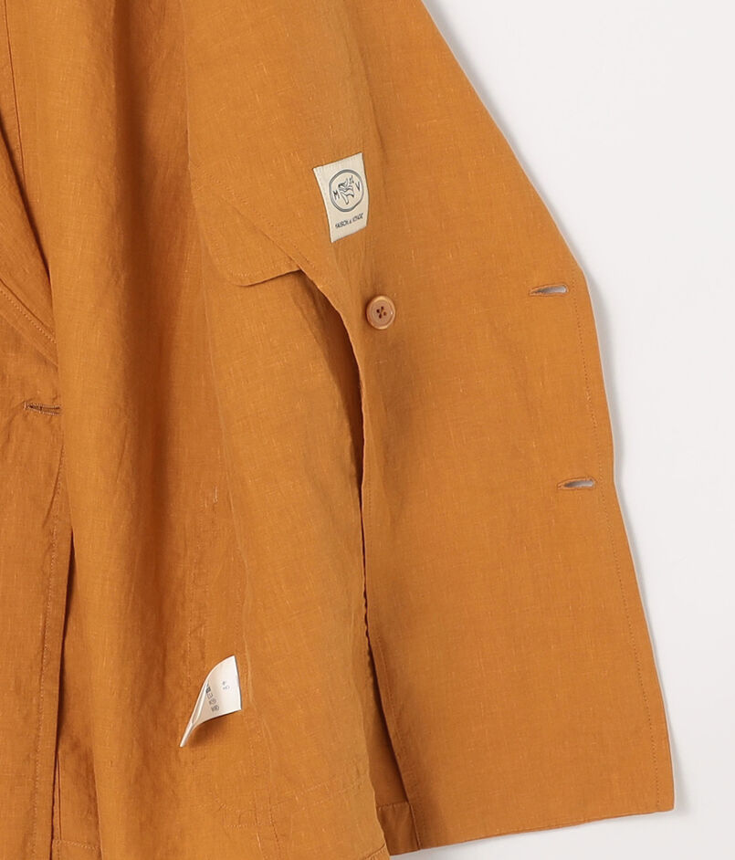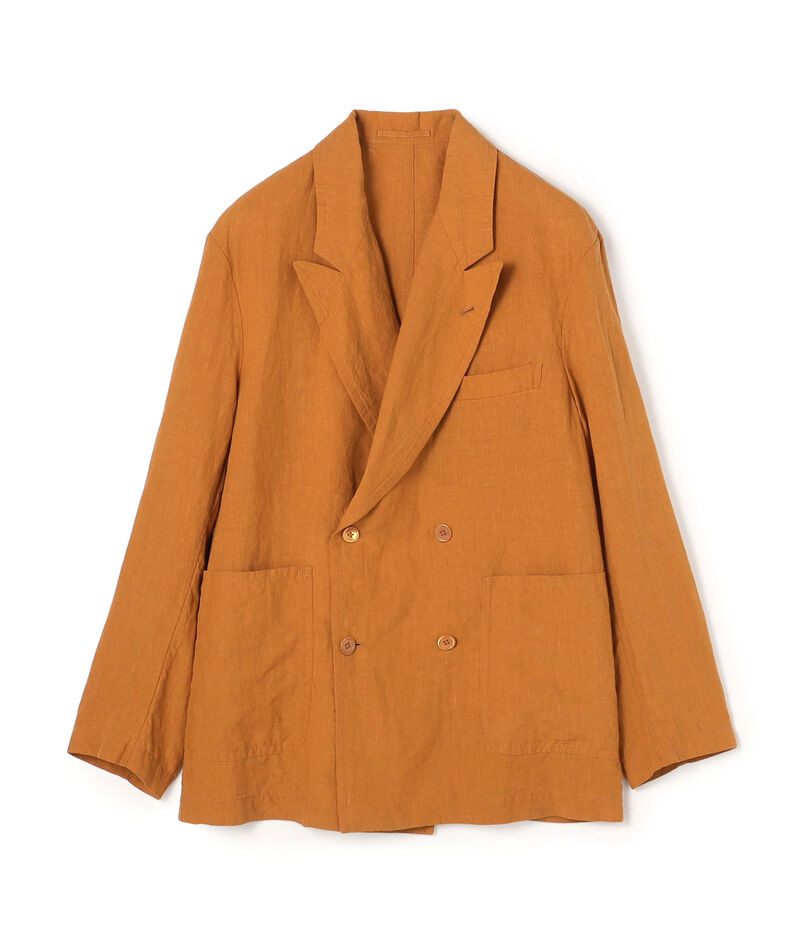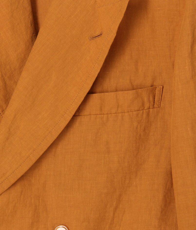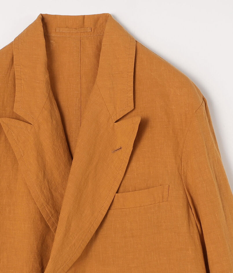 フロントのダーツを省いたボックスシルエットを採用し、身体を優しく包み込むようなほどよいボリューム感と丸みのあるラインを表現しました。ダブル4ボタンのピークドラペルは、あえてゴージ位置を下げることで、クラシックながらもどこか懐かしい趣のある表情に仕上げています。カーディガンのように軽やかに羽織れるリラックス感と、ジャケットの持つ端正な佇まいが同居した、夏の新しい羽織りとして重宝する一着です。