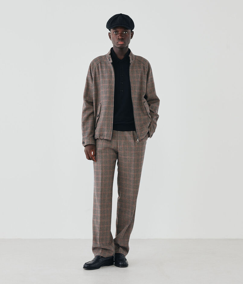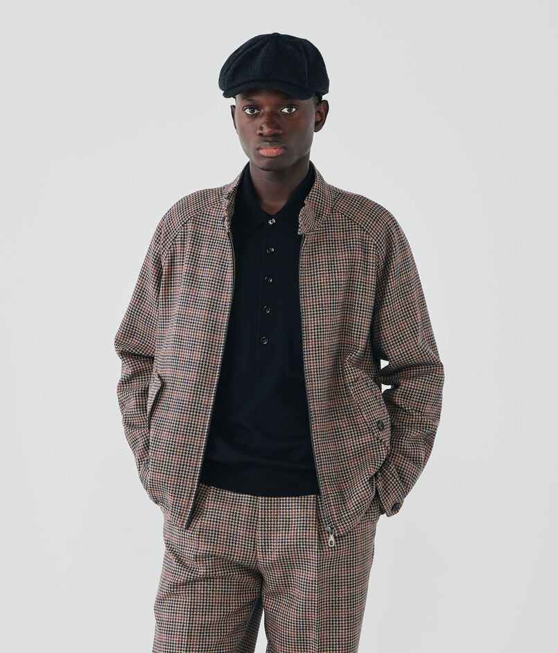 デザインは、ドックイヤーのG4スタイルのドリズラー。ナローなサドルショルダーが特徴。オーセンティックなショートブルゾンと相性の良い伝統的なツイード柄を掛け合わせた1着です。