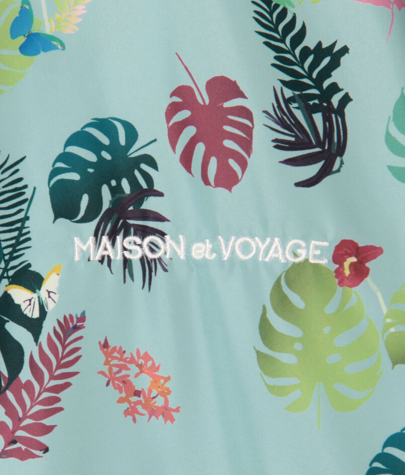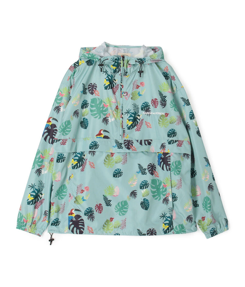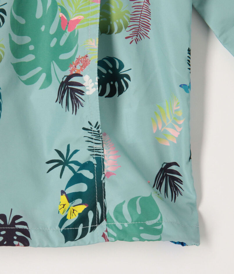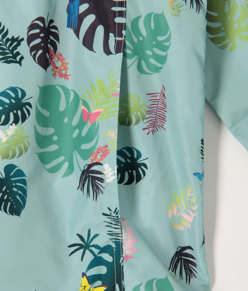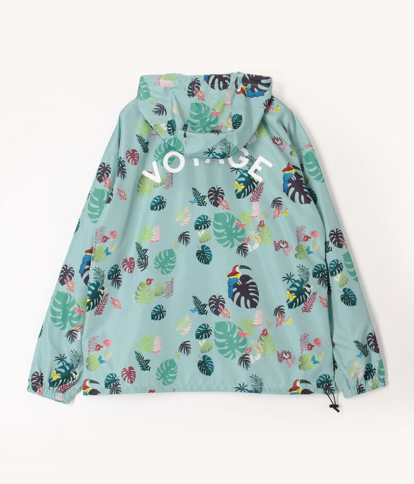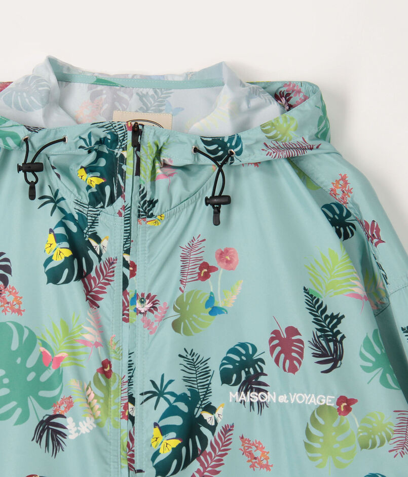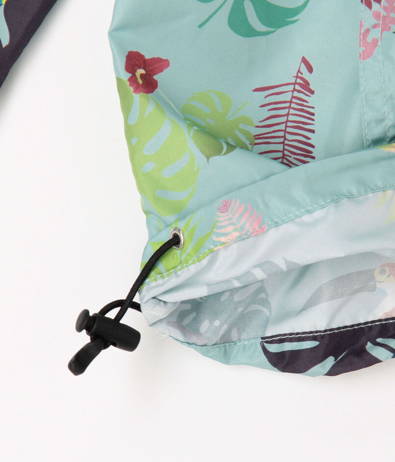 亜熱帯の植物や鳥のモチーフを、ニュアンスのあるイエローとライトブルーのベースにプリントしたフーデッドパーカー。軽量なポリエステル生地を使用しており、カラフルなトロピカルモチーフが夏の着こなしに遊び心をプラスします。