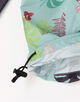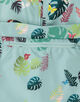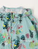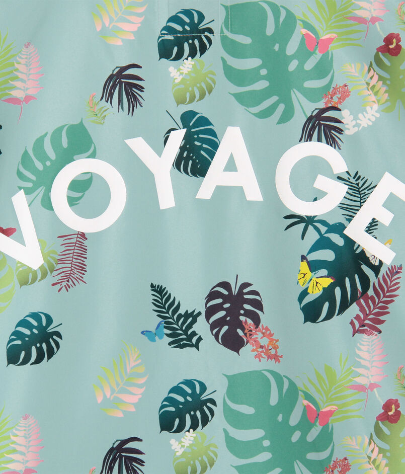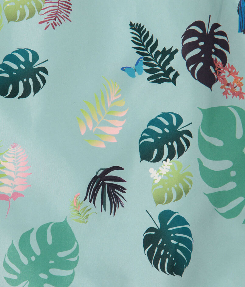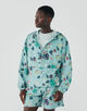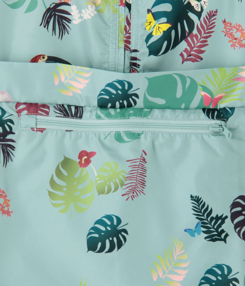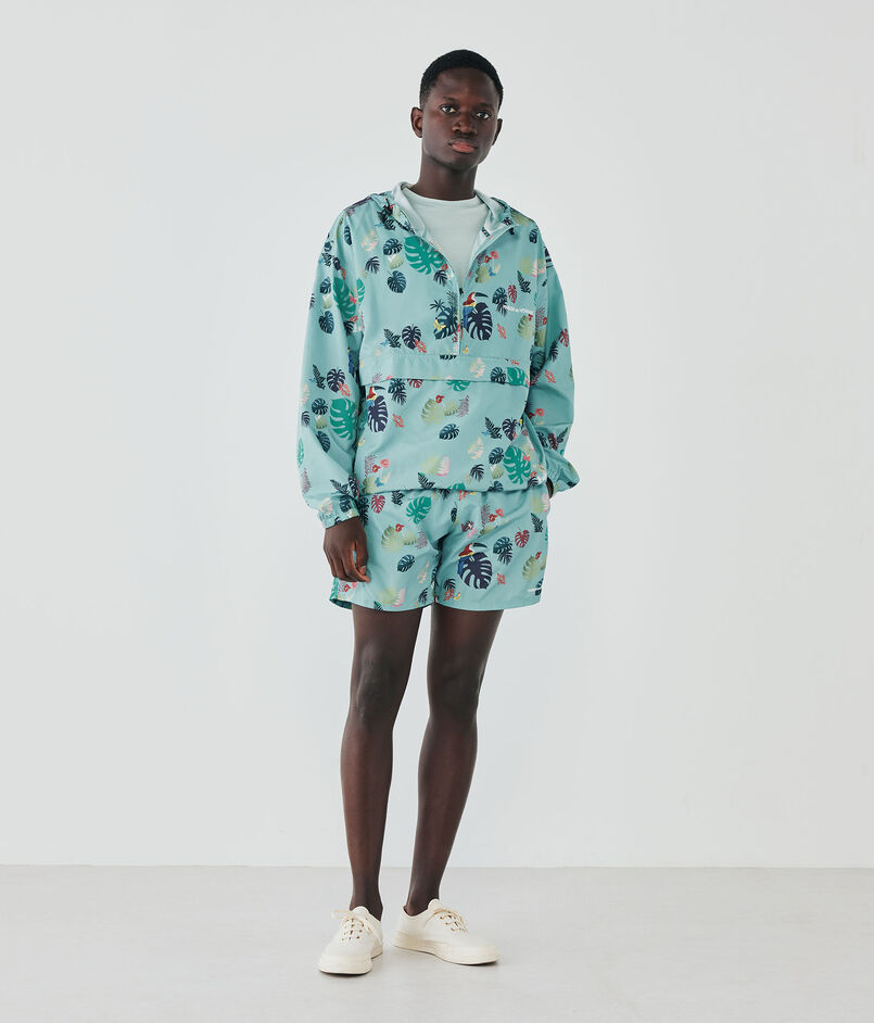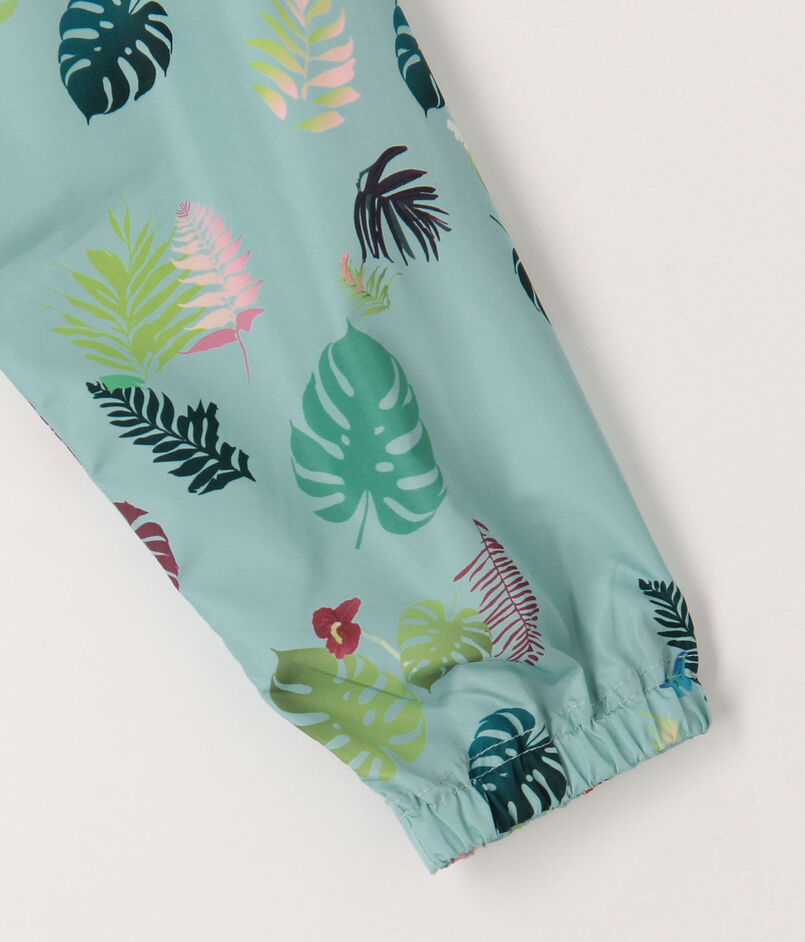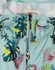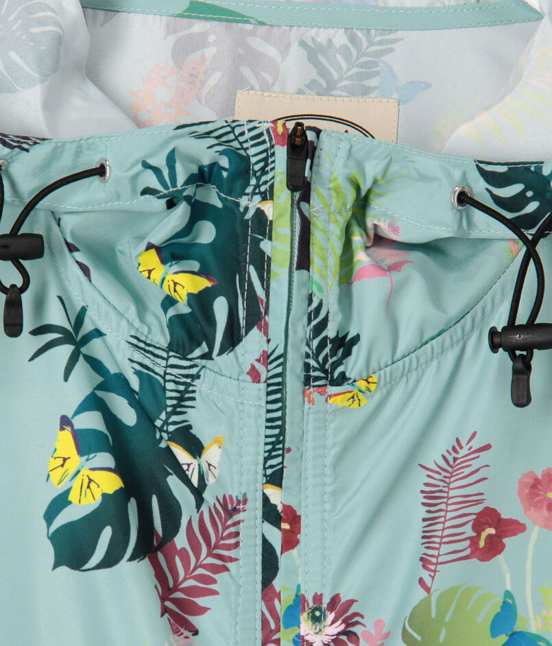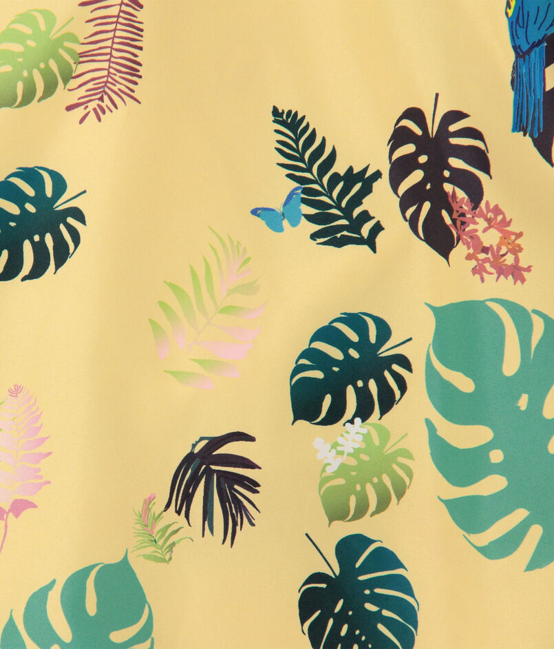 亜熱帯の植物や鳥のモチーフを、ニュアンスのあるイエローとライトブルーのベースにプリントしたフーデッドパーカー。軽量なポリエステル生地を使用しており、カラフルなトロピカルモチーフが夏の着こなしに遊び心をプラスします。