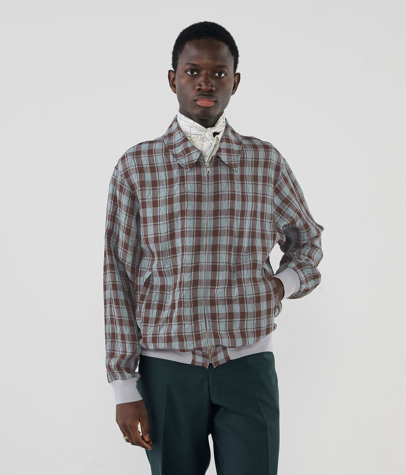 モデルは夏でも羽織れるアウターとして、シングルジップで軽快に仕立てました。暑さを感じさせない清涼な素材感に加え、襟や袖口には重さを削ぎ落としたハイゲージのシングルリブを採用。シンプルな佇まいの中に、素材へのこだわりと季節に寄り添う機能美が宿る一着に仕上がっています。