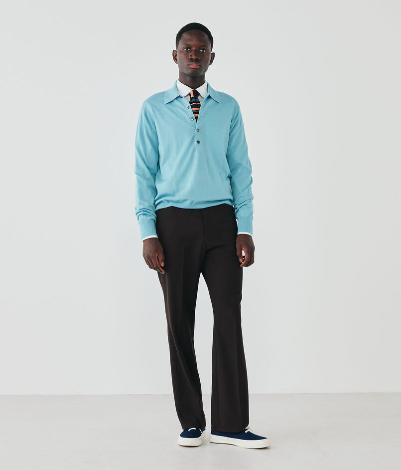 シェイプについても、一般的なニットタイと比較し、〈MAISON et VOYAGE〉の展開するドレスシャツの衿型とバランス良くはまるように、大剣巾をやや広げています。