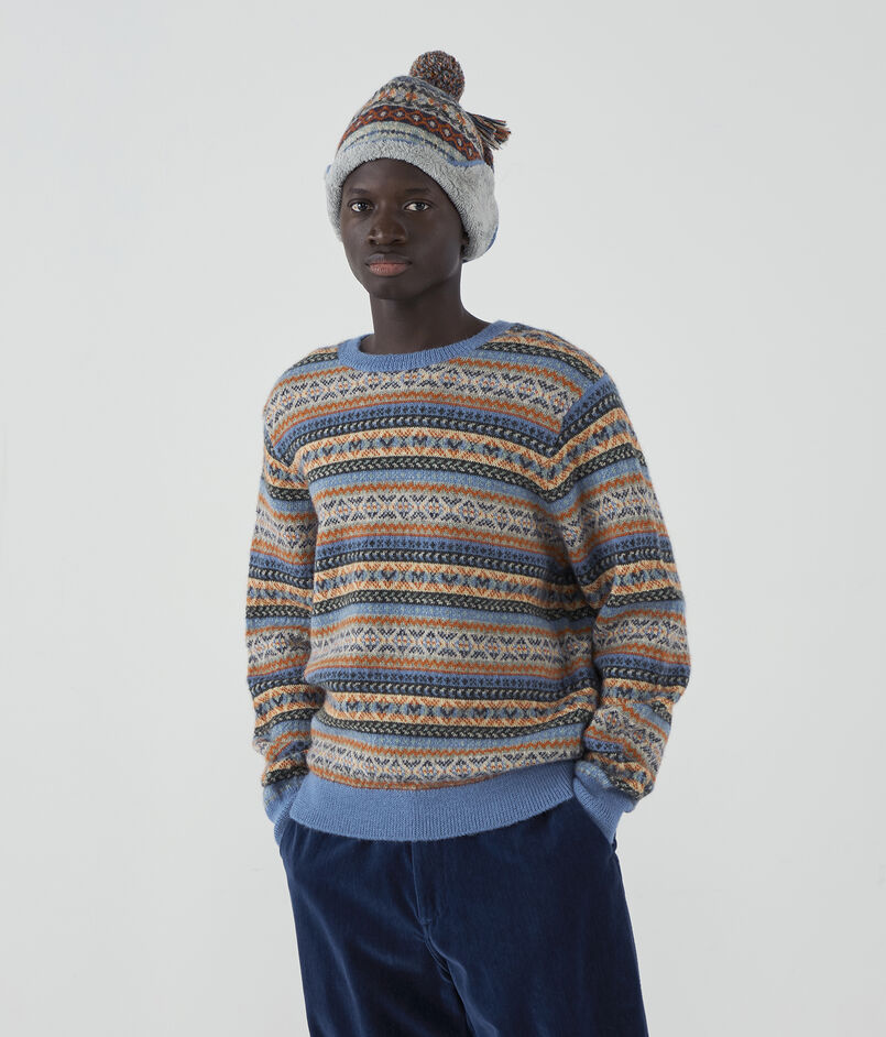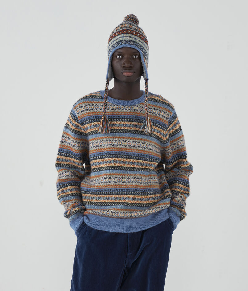 ペルー産アルパカと英国紡績による梳毛ウールをブレンドした、秋冬に最適なフェアアイルジャカードニットコレクション。同じ素材、柄表現でクルーネック、ニットベスト、帽子、マフラーの4型をご用意しました。
