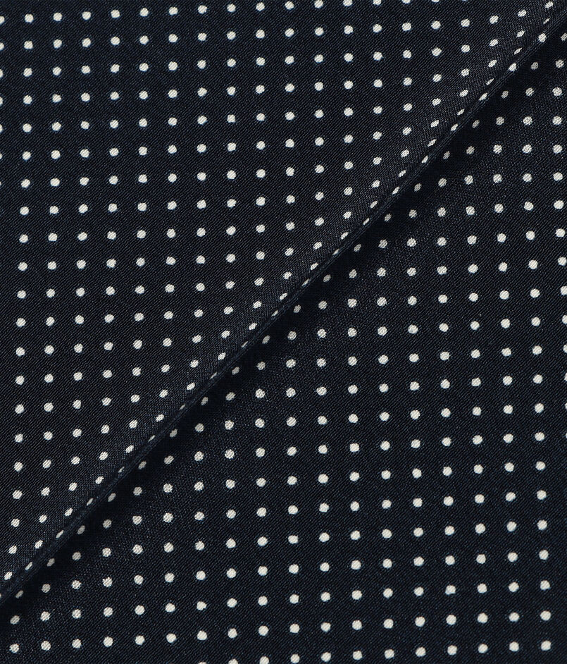 〈MAISON et VOYAGE〉オリジナルシルクプリントスカーフ。素材は18匁のシルクデシンにドット柄をプリント。遠目では無地にも見える1mmドットはバランスを崩すことなくスタイリングに馴染んでくれます。豊富なカラーバリエーションを用意し、気分やスタイリングに合わせてカラーを選ぶことができます。