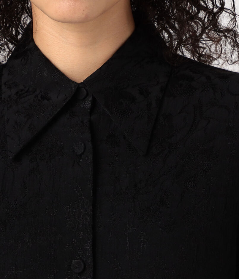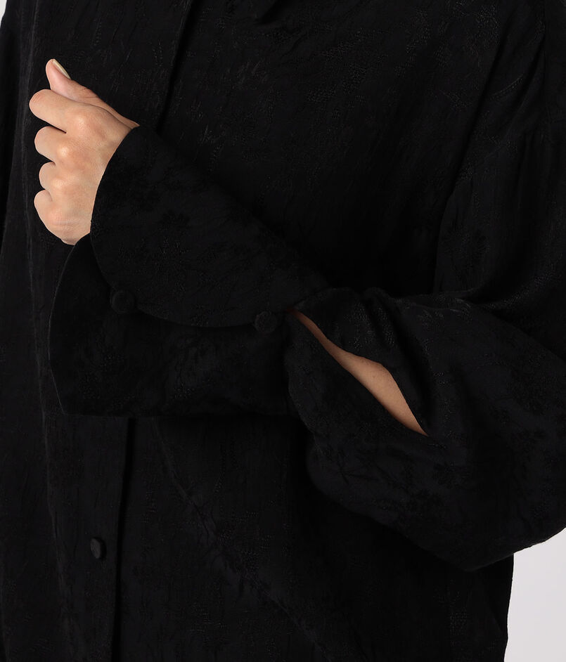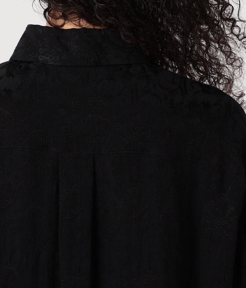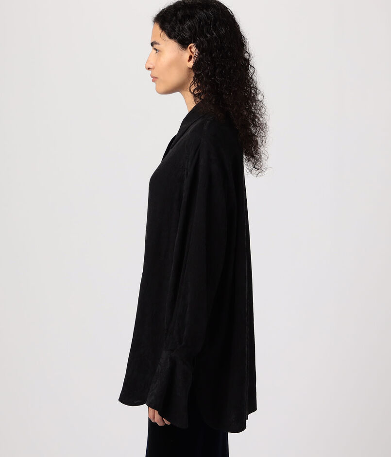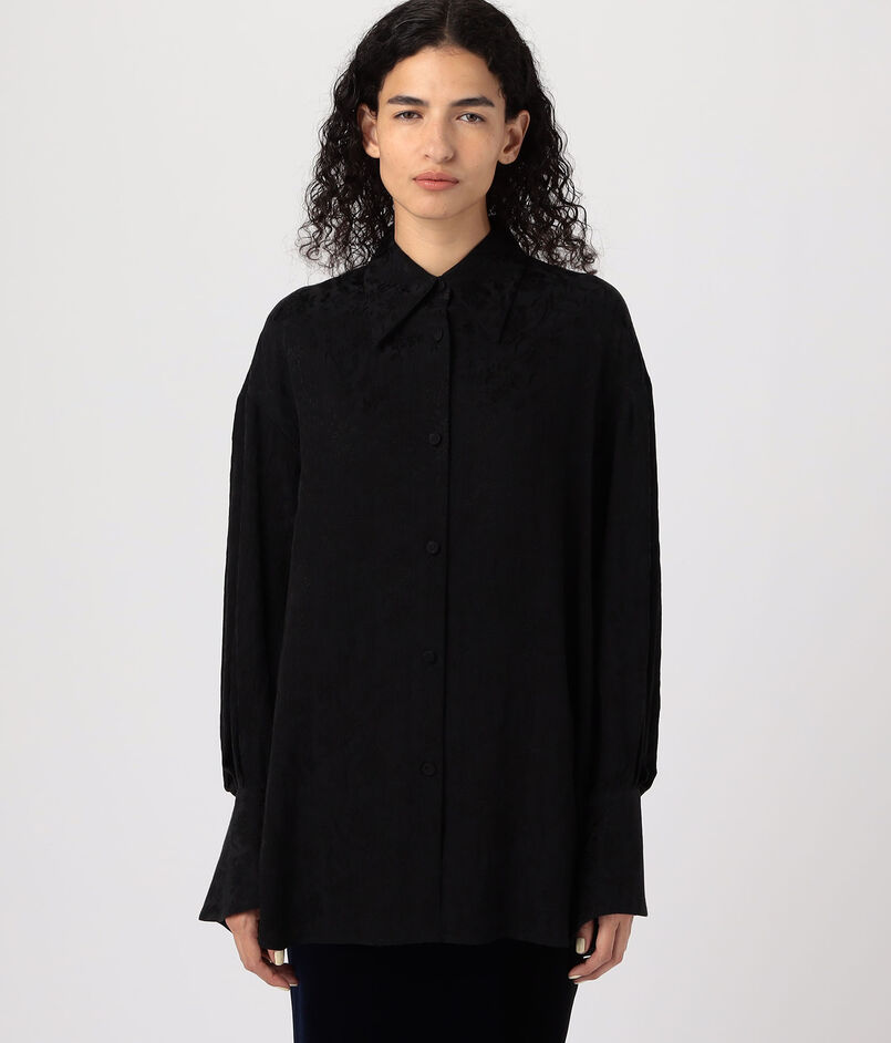適度な光沢感が美しいシャツは、存在感のある袖のカフスや、ゆったりとしていながら身体をコンパクトに魅せるカッティングが特徴的。