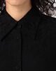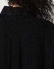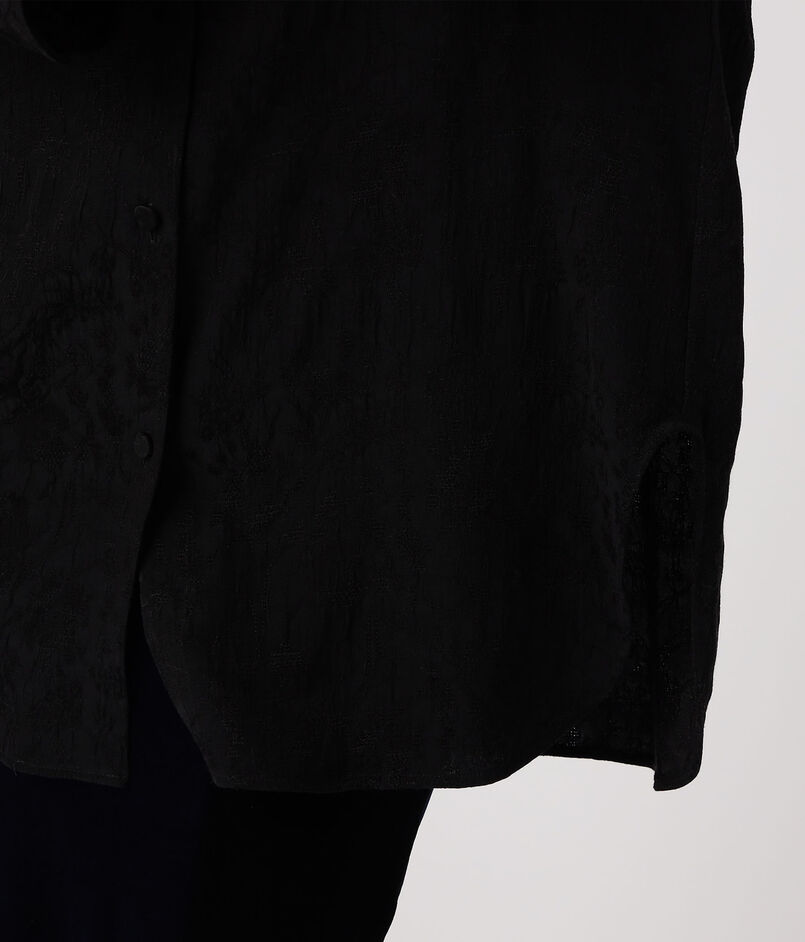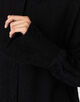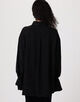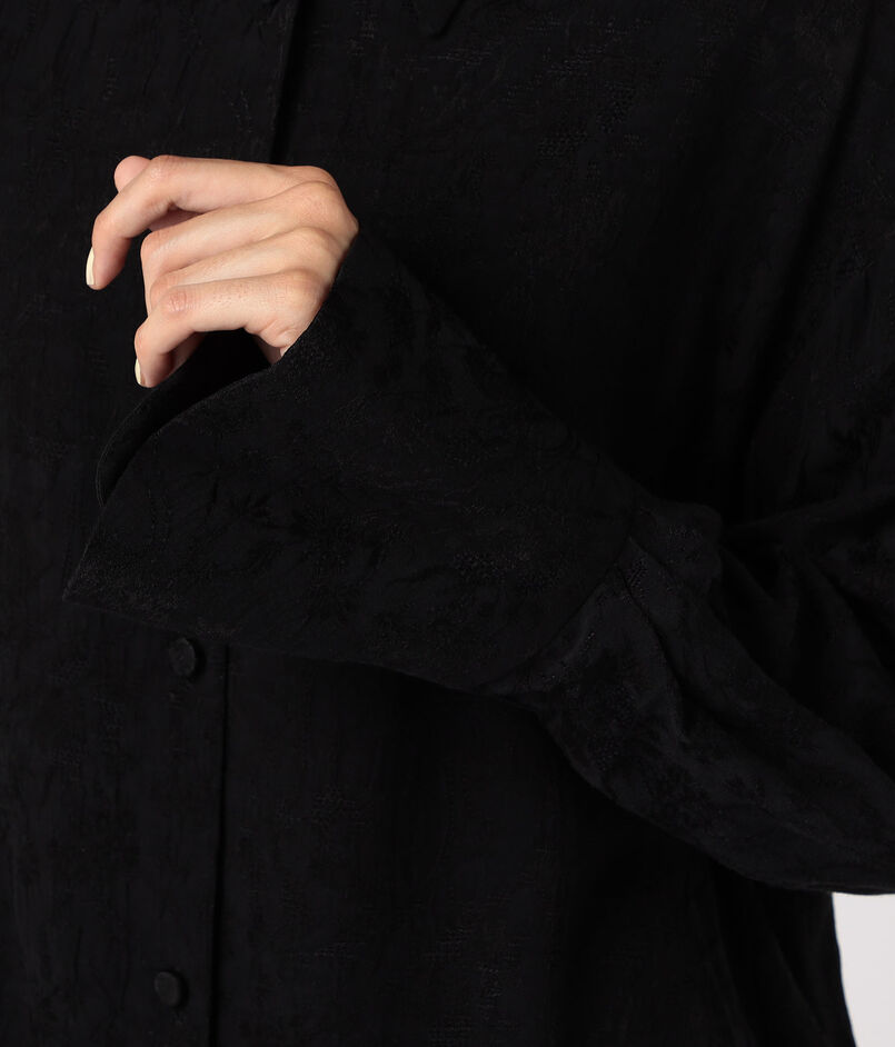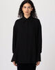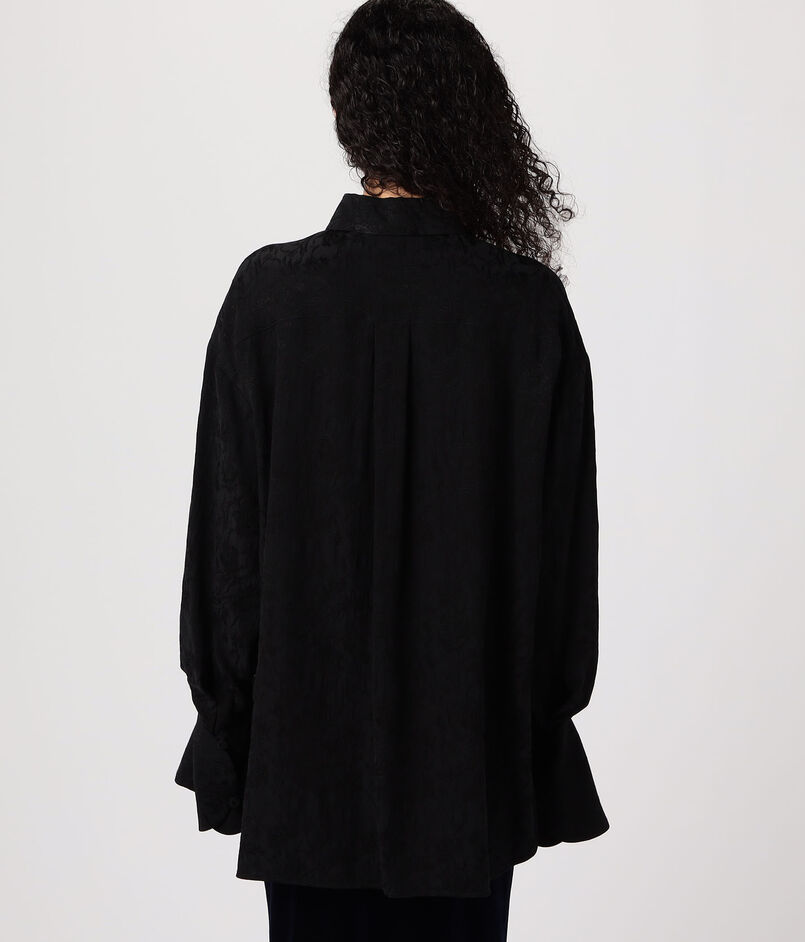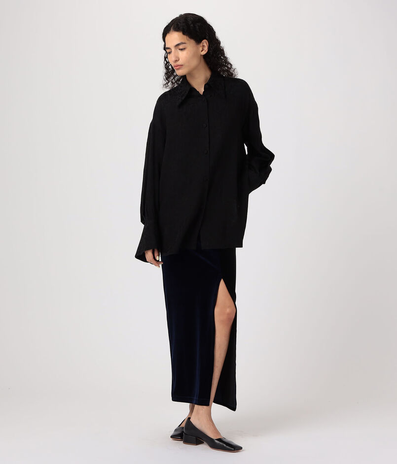 適度な光沢感が美しいシャツは、存在感のある袖のカフスや、ゆったりとしていながら身体をコンパクトに魅せるカッティングが特徴的。