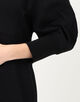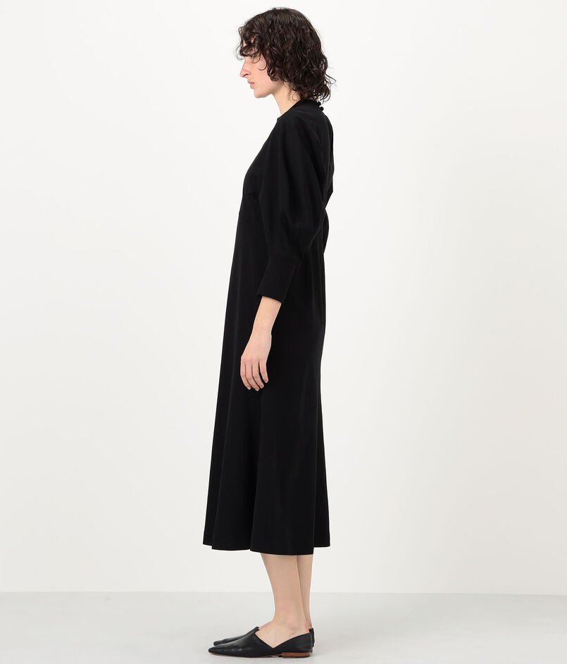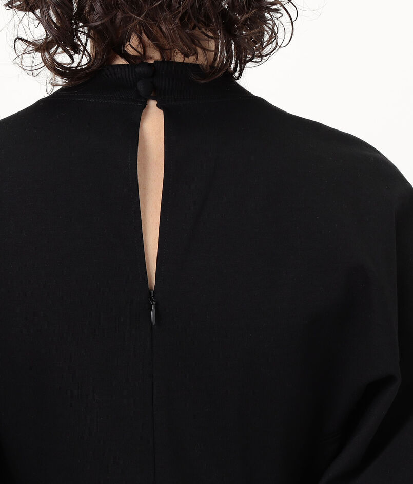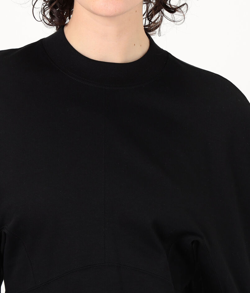 カジュアルな素材ながら、構築的なフォルムが身体を立体的に見せてくれる一着。