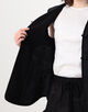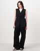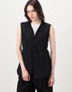 ウエストをマークする紐や柔らかくカーブするパイピングが立体感を添え、襟元や裾の曲線的カッティングがモダンでミニマルな印象の一着です。