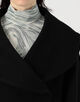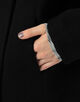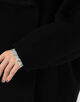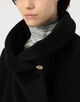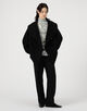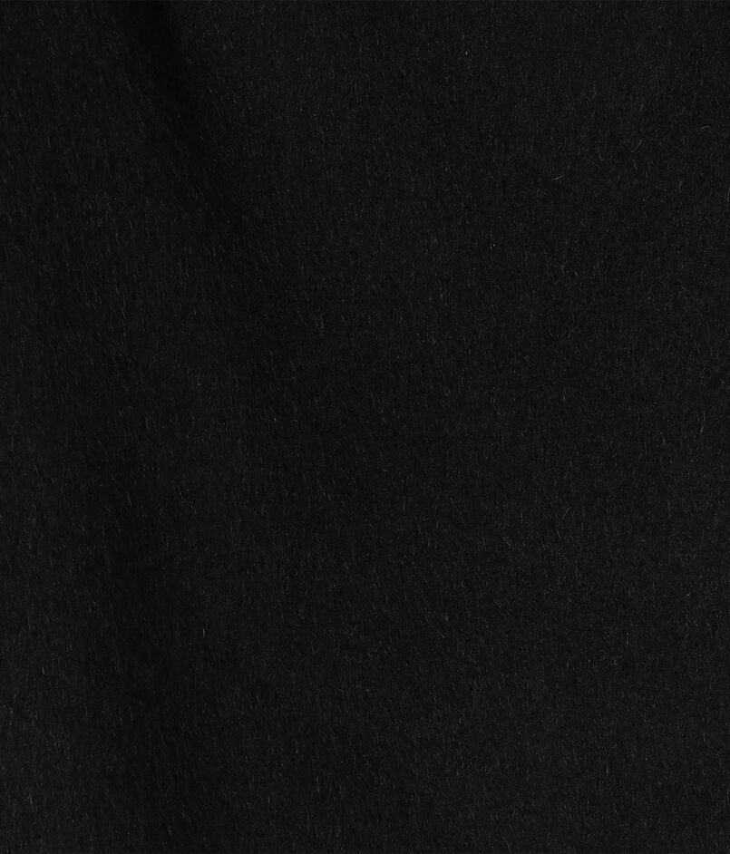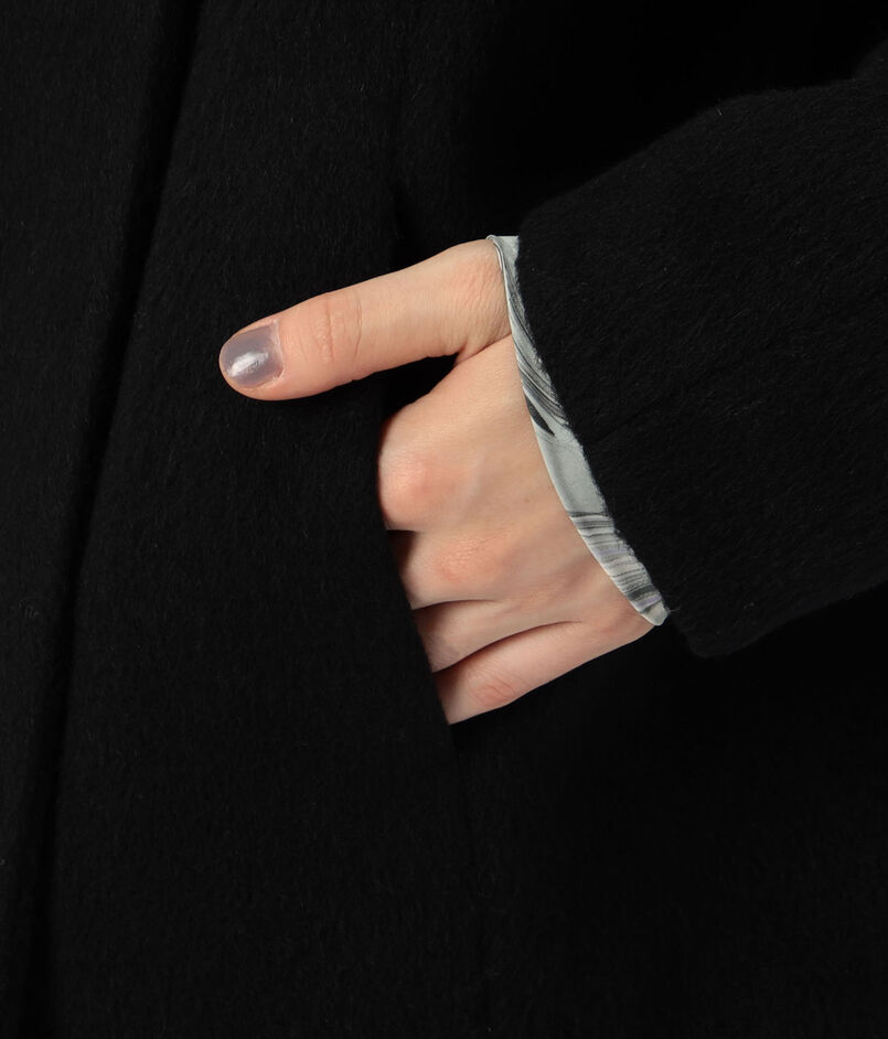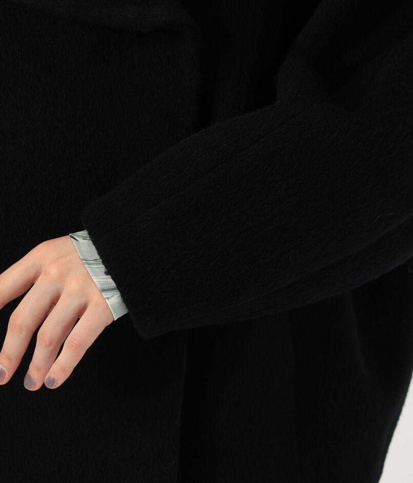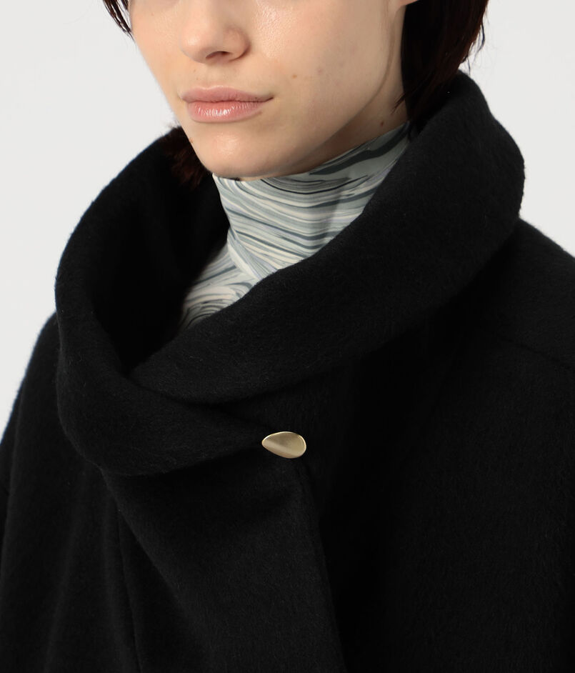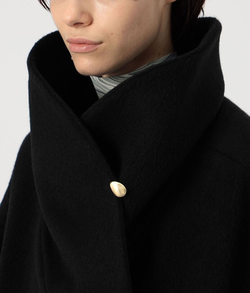 紡⽑ラムウールとアルパカにモヘアをブレンドした光沢のある⽷を使⽤し、シャギー仕上げのショート丈のコートは、襟裏に隠れた石ころを思わせるシェイプのゴールドボタンを留めることで首まわりをふわりと包み込み、一着で多様な着こなしをすることができます。