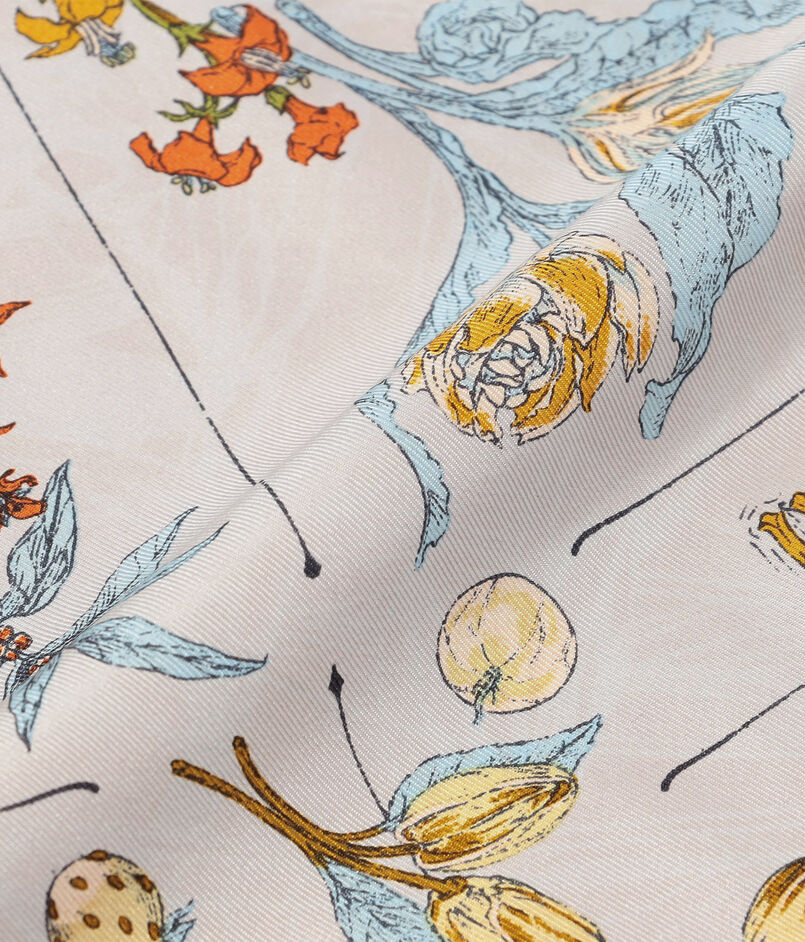 ヴィンテージスカーフからインスピレーションを得てつくられるスカーフやストールは、全て熟練の職人により一版ずつ手作業で丁寧に染め上げる手捺染(ハンドプリント)で作られています。