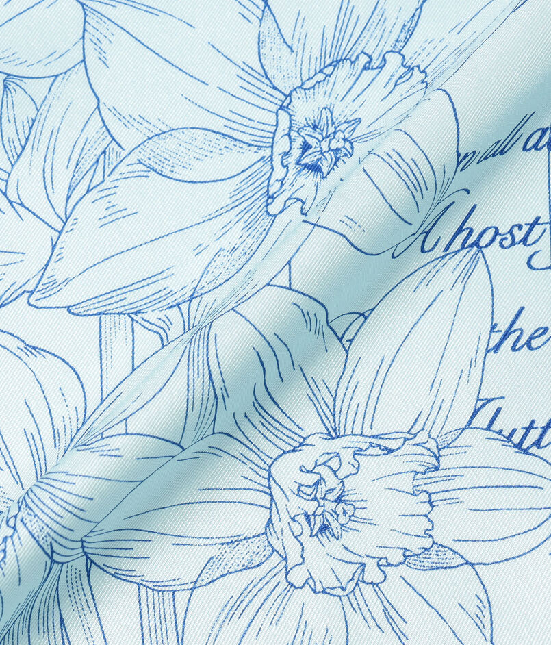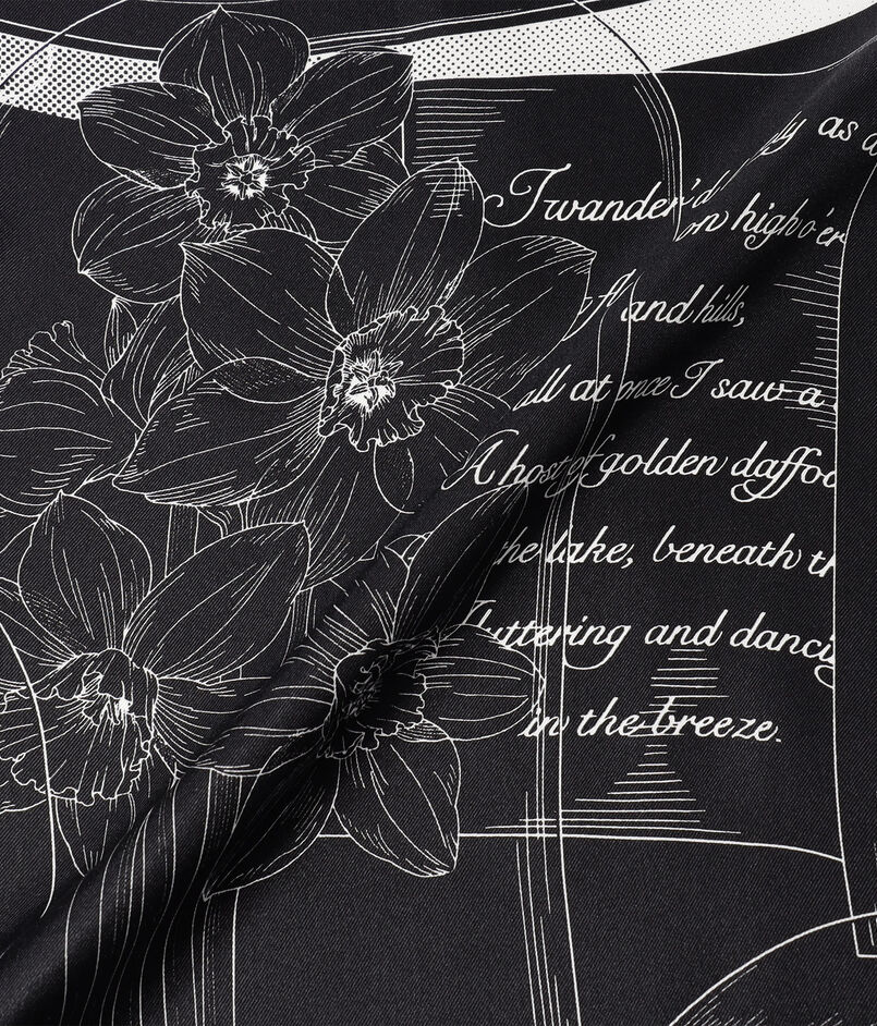 シンプルな線画の中に、さまざまな形のガラスドームと花々を配し、そこに詩を織り込むことで、奥行きと見応えのある図案に仕上げています。