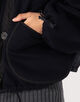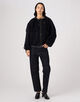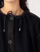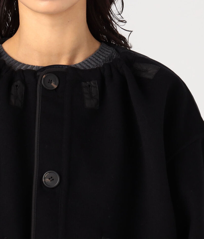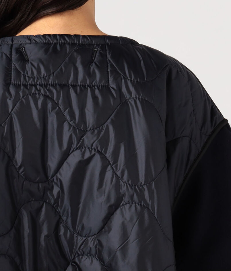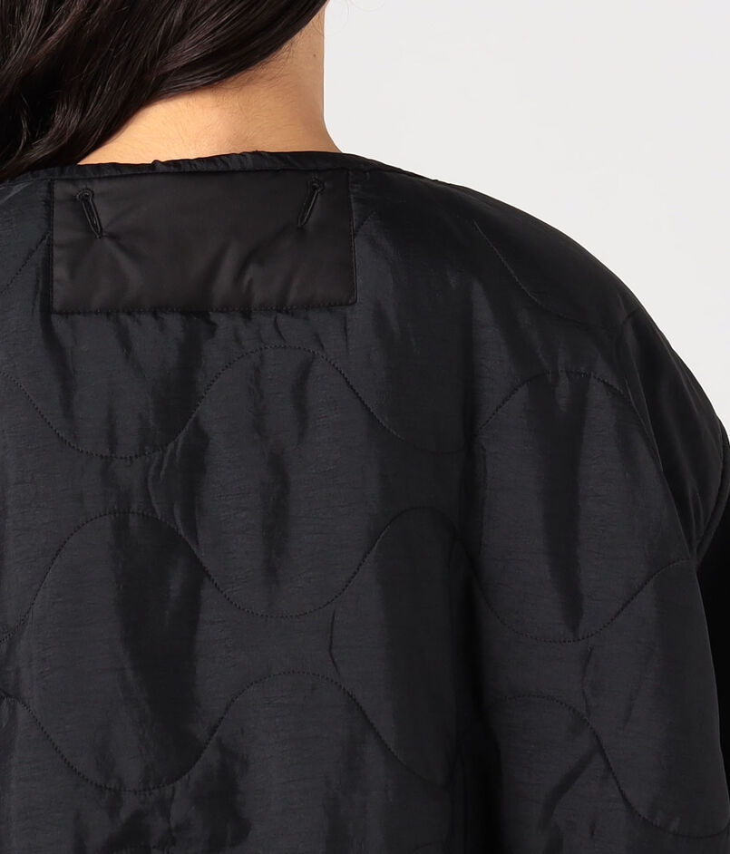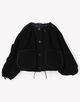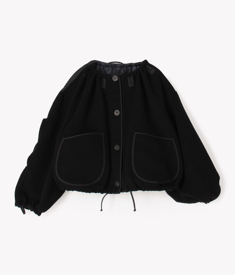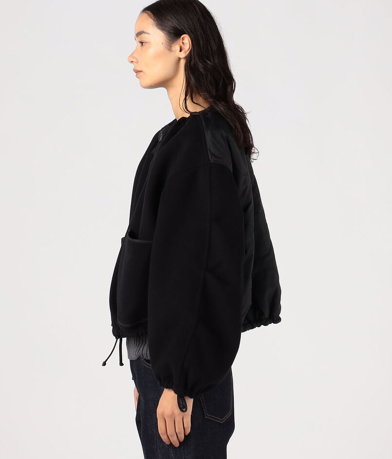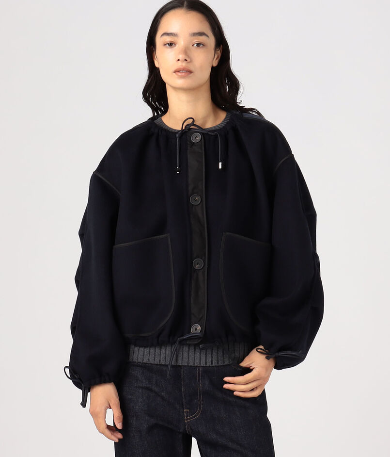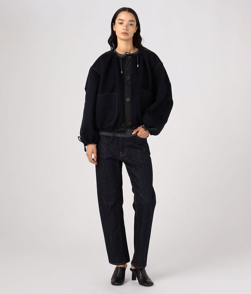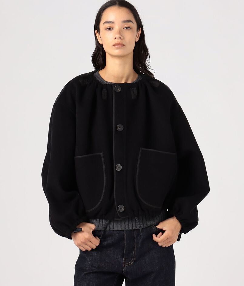袖のタックディテールやパイピングなどこだわりのディテールが光り、クロップド丈のオーバーサイズシルエットは、ネックライン、裾や袖口などはドローコードで調整可能。