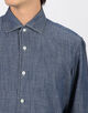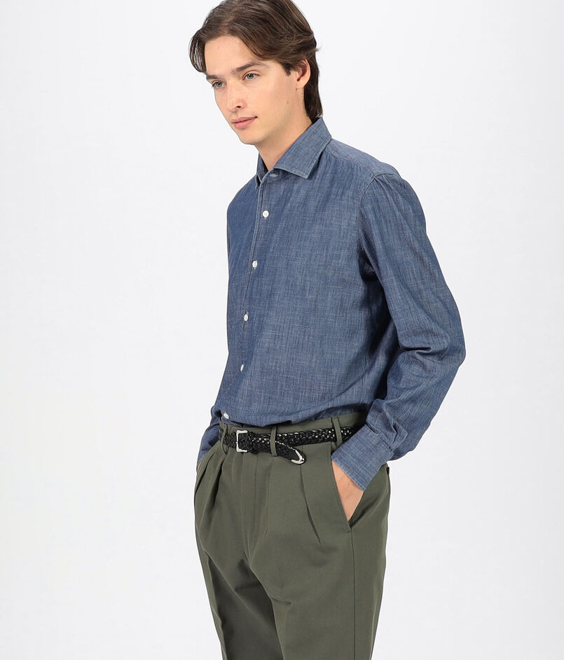 台襟がない一枚仕立てのワンピースカラーシャツは襟のロールが美しく、ノータイのジャケットスタイルにもおすすめです。