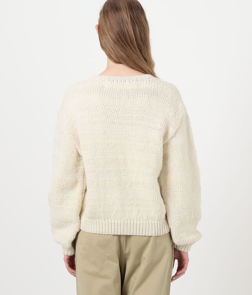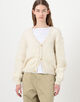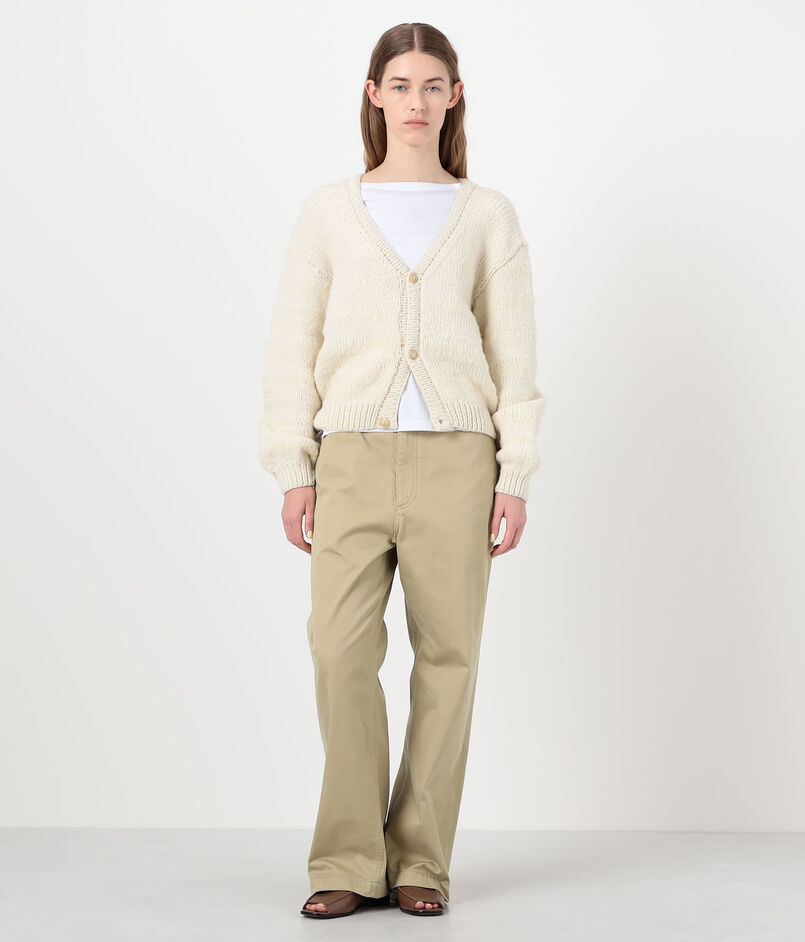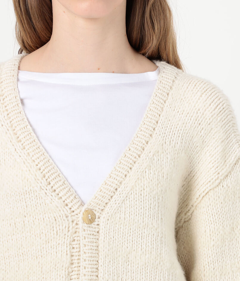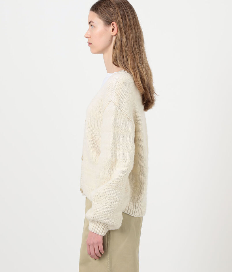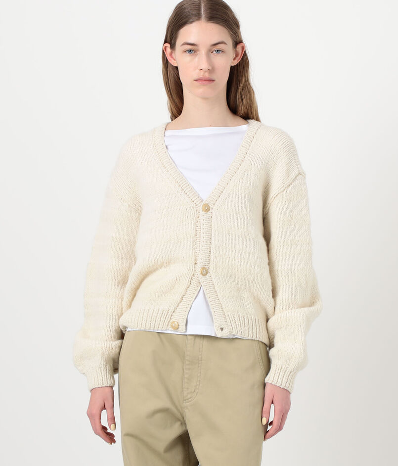メリノウールとモヘヤの混紡糸を使用した、ふっくらとしたテクスチャー感が魅力のカーディガンです。