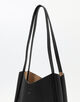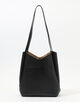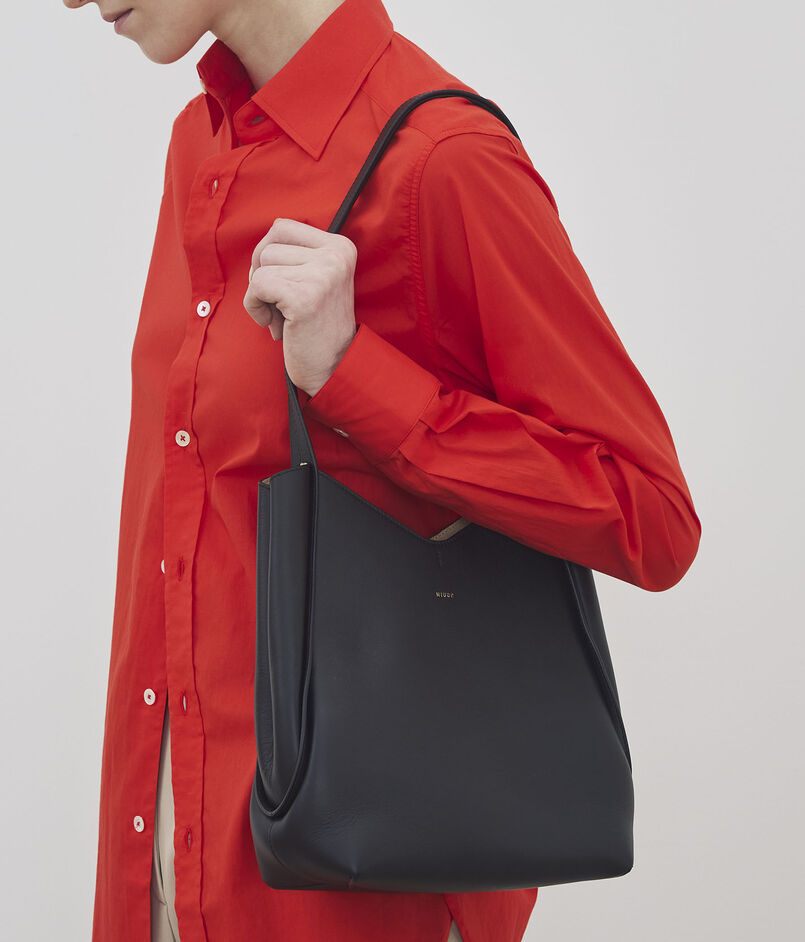 スマートな縦長のフォルムがモードな印象のトートバッグ。