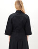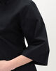 長めでゆったりとしたハーフスリーブとスリムなボディの絶妙なバランスが特徴で、ミニマルながら存在感のある一着です。