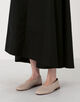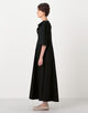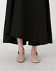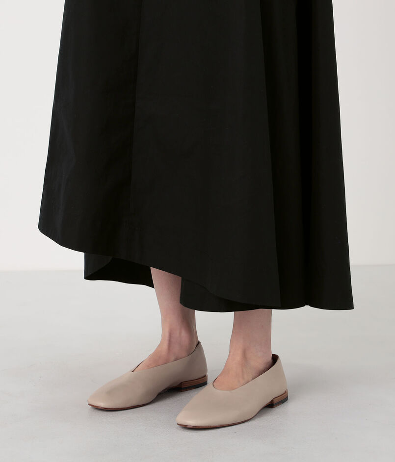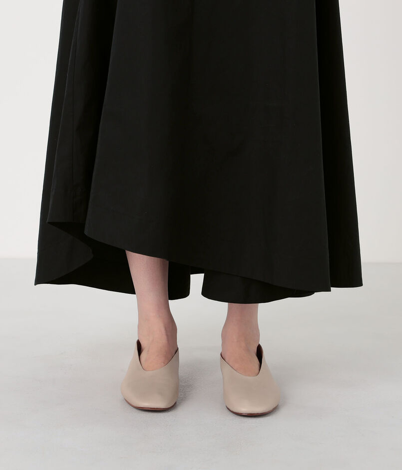 重く見えがちなブラック×ロング丈のコンビネーションも、美しいフレアシルエットと後ろ下がりのアシンメトリーなヘムラインで軽やかな印象に。