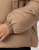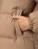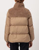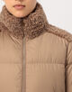 マットな質感が上品な印象を与えるパディング入りのポリエステル素材に、襟元と背面にはふんわりと柔らかなテディフリースをプラス。