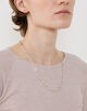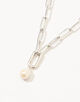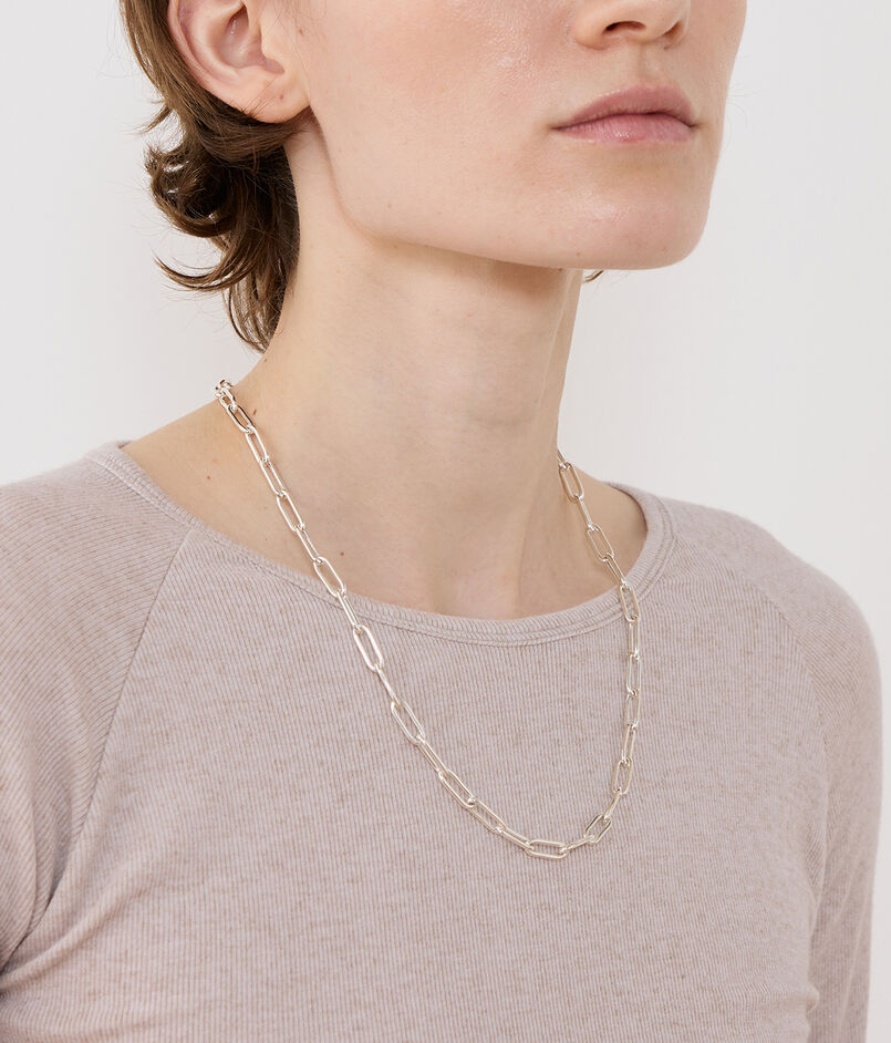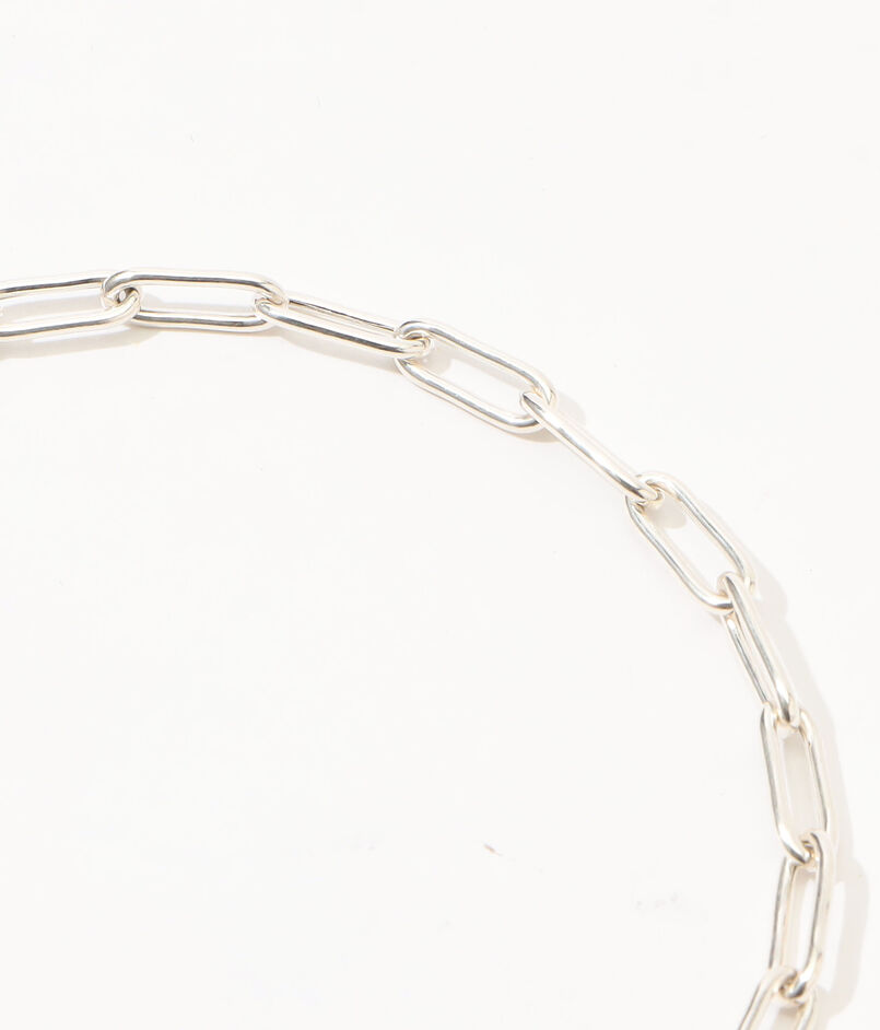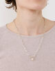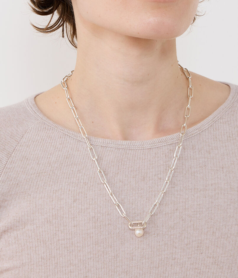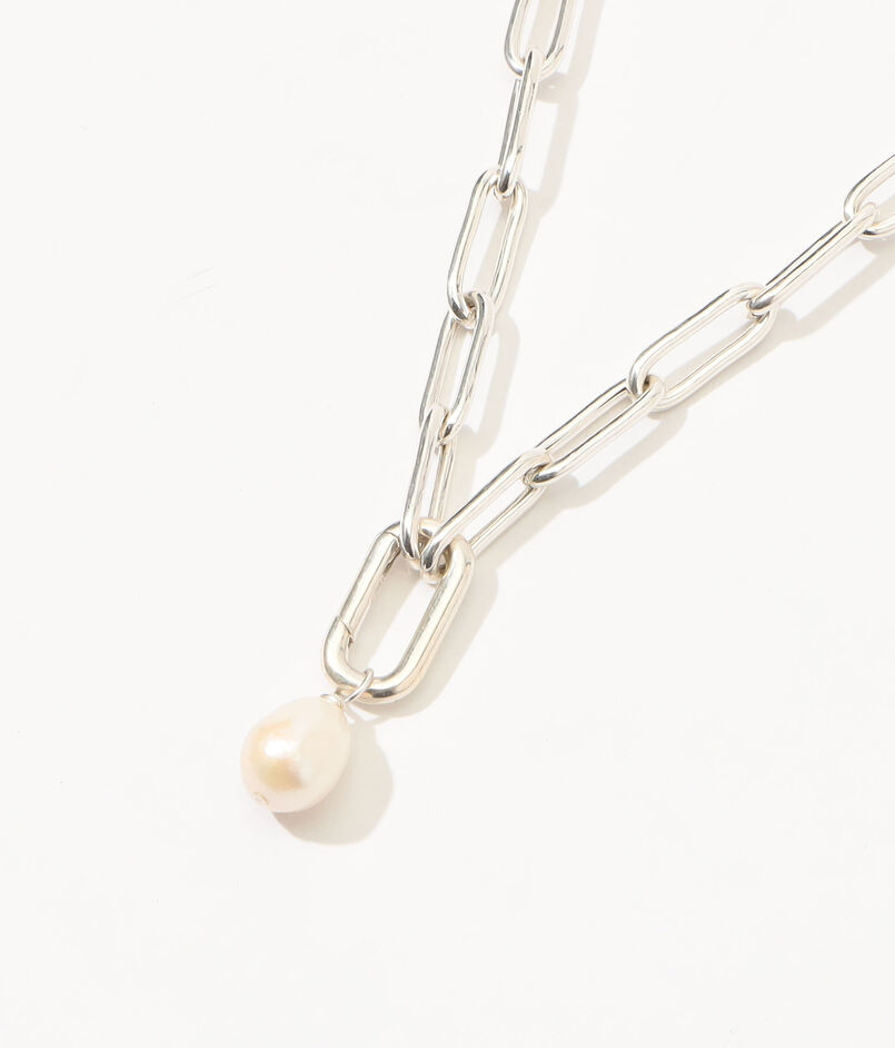フェミニンなイメージのパールと無機質なスクエアチェーンのコンビネーションがユニークなネックレス。