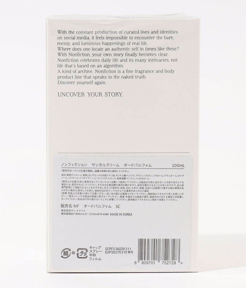 サンタルクリームはノンフィクションを代表する香りで、さっぱりとしたイチジクとやさしいウッディ系の香調が適切なバランスを作り上げます。