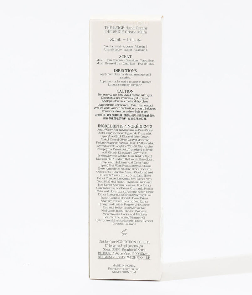 ベタつかず素早くなじみ、ベルベットのような柔らかさだけを残すノンフィクションハンドクリームは、シアバター(保湿成分:シア脂)とビタミンE(整肌成分:トコフェロール)を配合、乾燥した手肌をよりなめらかに整えます。 手の温もりを通して周りに広がる魅力的な香りは、あなたの空間の中で異色の余韻と表情をお届けします。