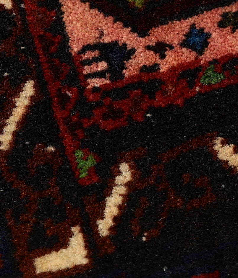 このラグの最大の特徴は、深く沈んだ濃紺のフィールド全体に広がるウェーブ状の幾何学モチーフで、濃赤や茶といった定番色に加え、中央に浮かぶ淡いピンクや青、黄色のモチーフが、ラグ全体に幻想的で複雑な表情を与えています。